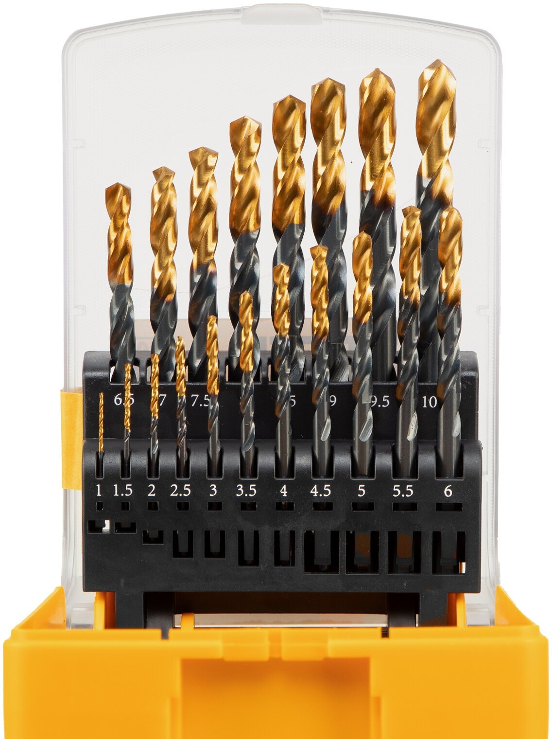 Купить Сверла по металлу Denzel Golden Tip, 1-10 мм, 19 штук, сталь HSS-Tin, цилиндрические и 3-гранные хвостовики, 72321