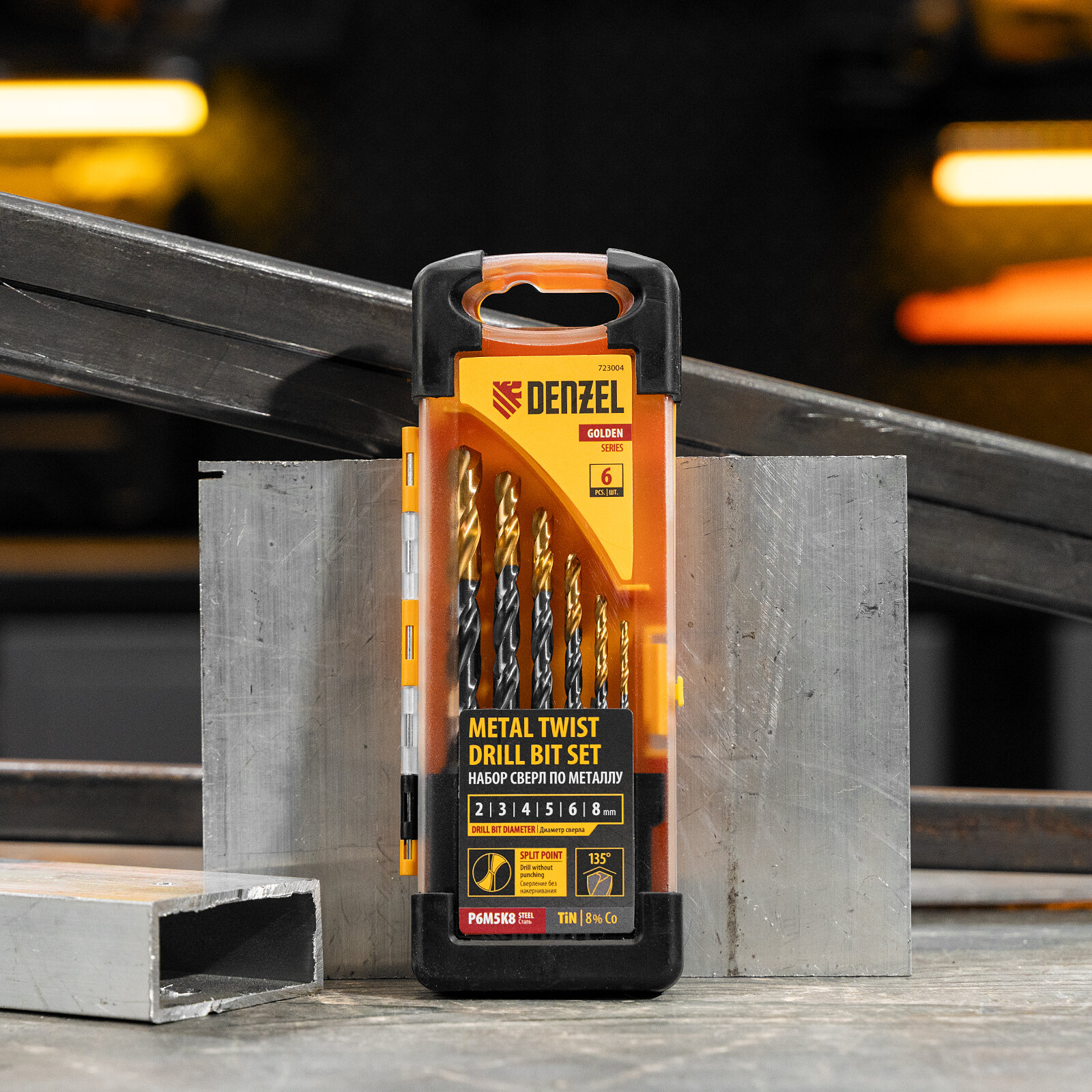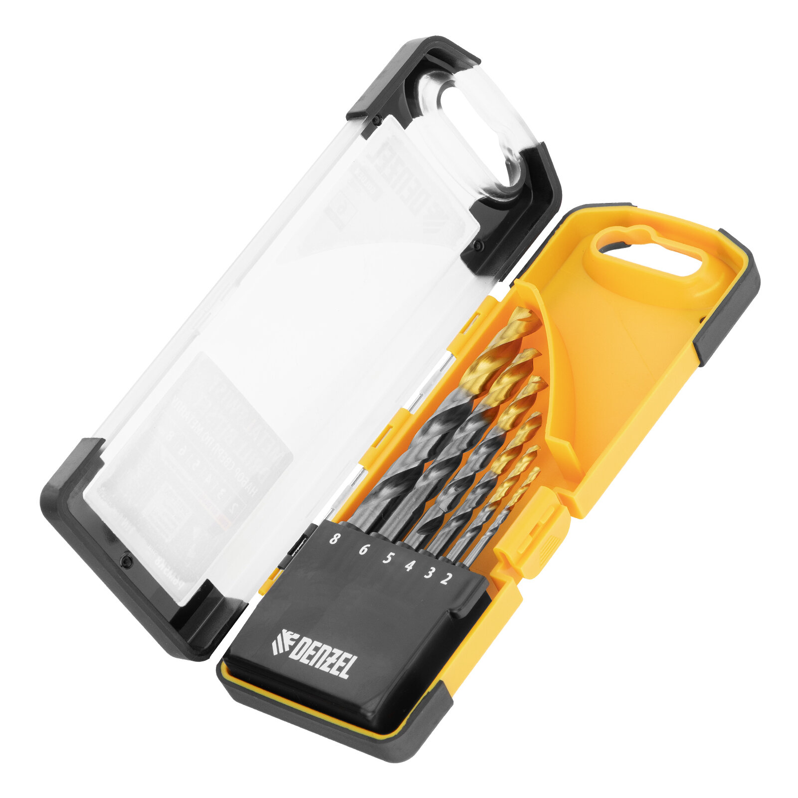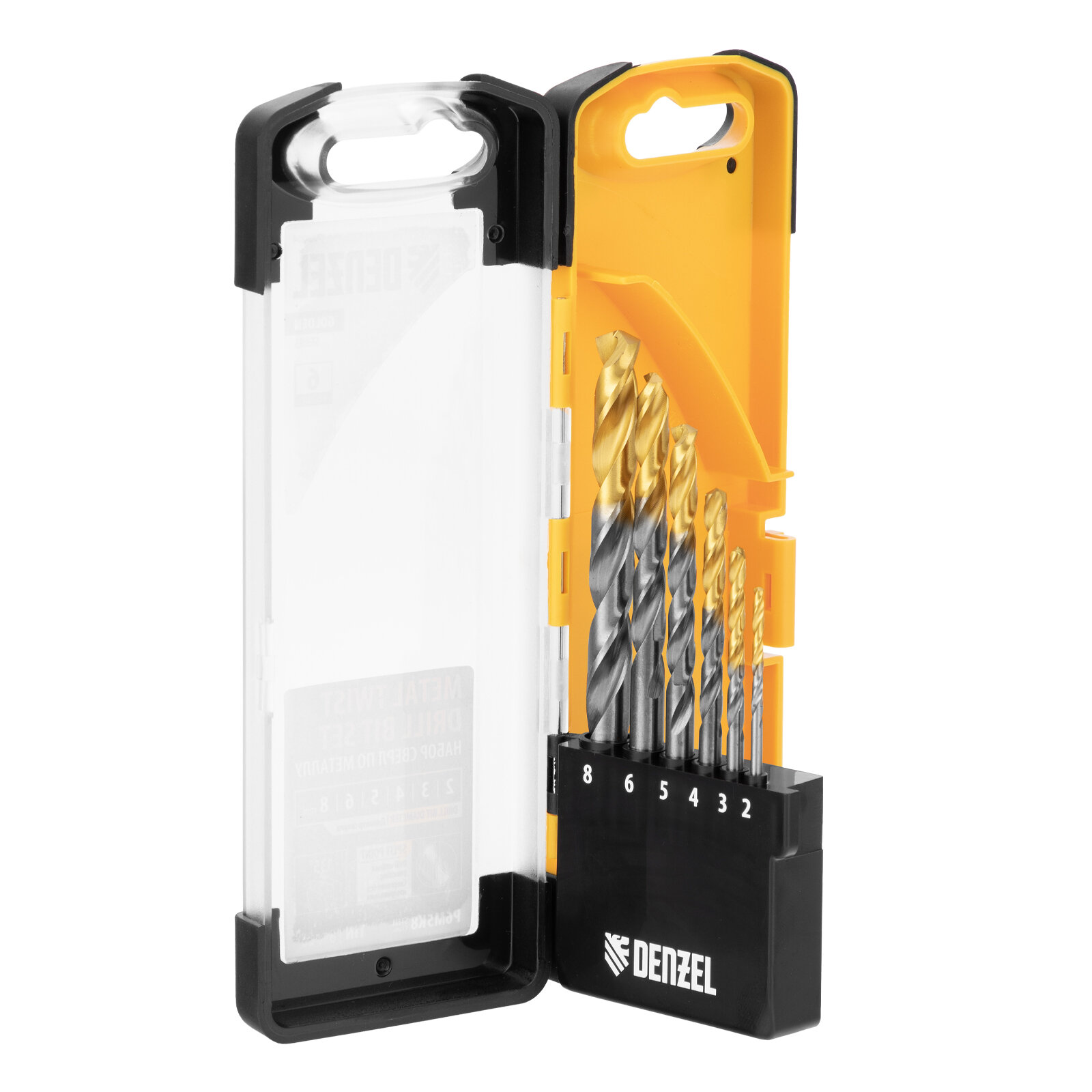 Купить Сверла по металлу Denzel Golden Tip, 2-8 мм, 6 штук, сталь Р6М5К8-TiN, цилиндрические и 3-гранные хвостовики, 723004