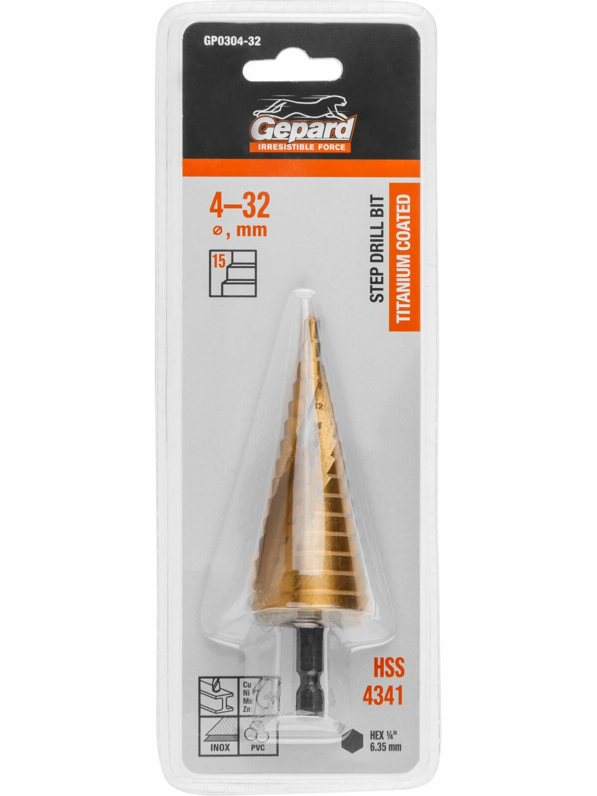 Купить Сверло по металлу ступенчатое 4-32 мм GEPARD HSS TiN (GP0304-32)