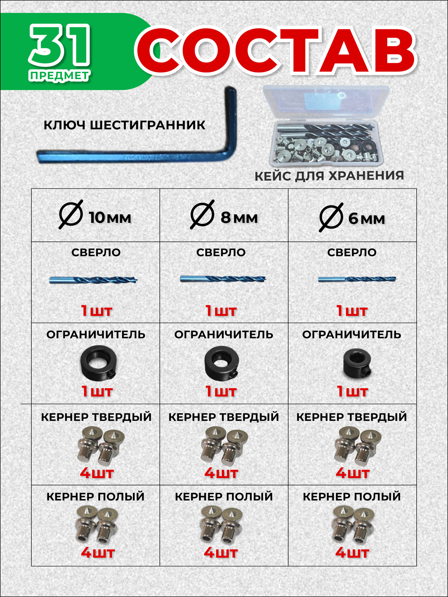 Купить Набор кернеров, для дерева, круглое сечение, 31 предмет, 6, 8, 10 мм