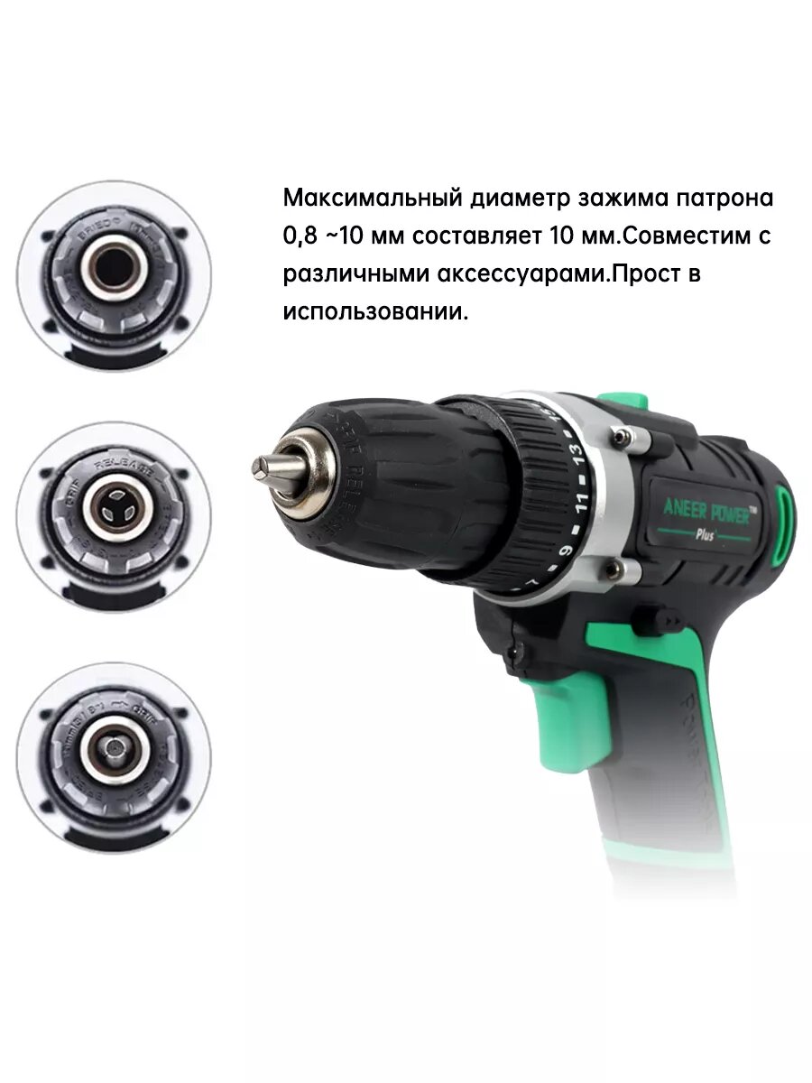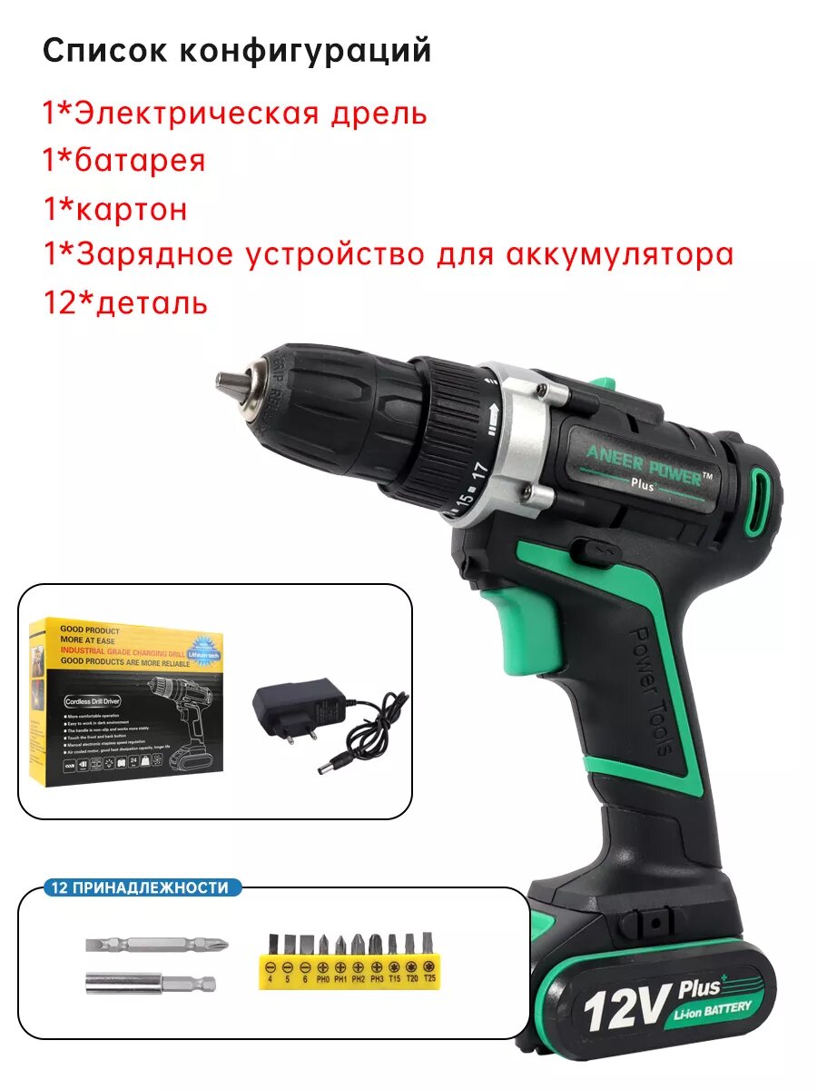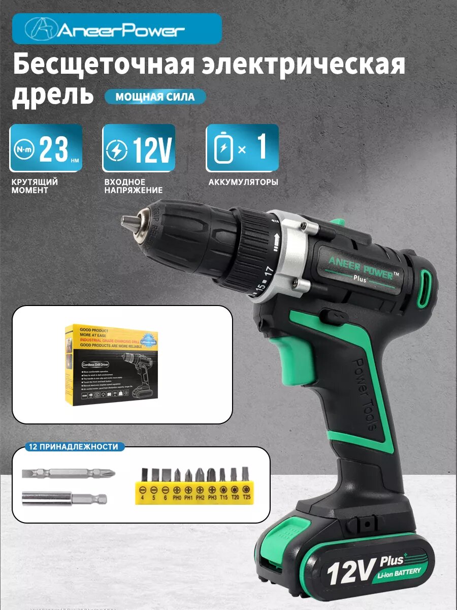 Шуруповерт AneerPower, ударный, 12В, бесщеточный, металл, пластик, зеленый 1 аккумулятор 1,5 Ач. интересное: