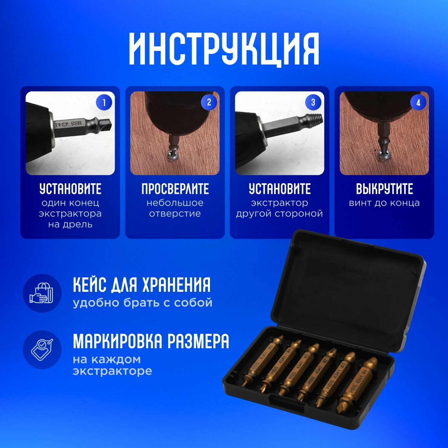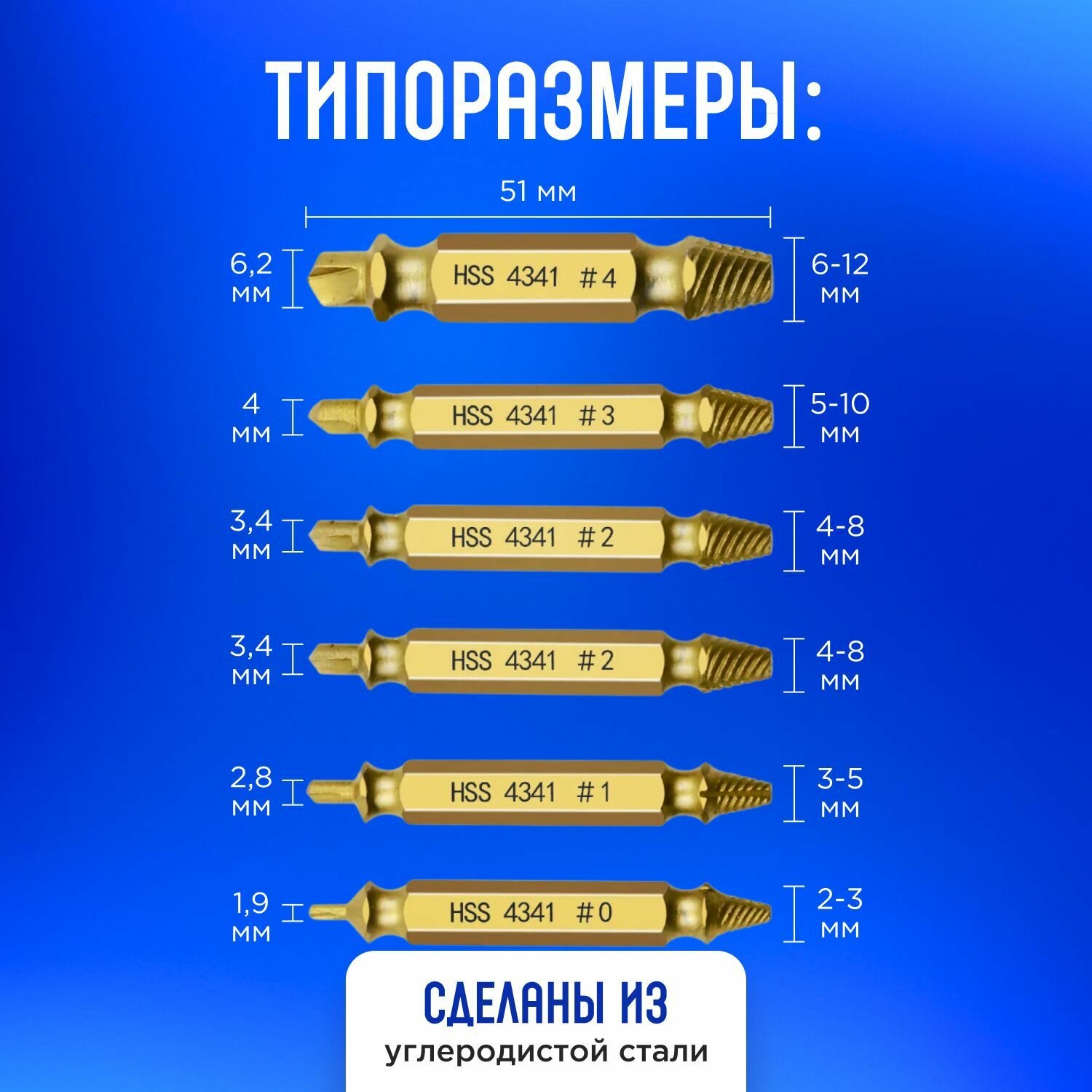 Набор двухсторонних экстракторов для извлечения сорванных шурупов, саморезов, болтов 6шт интересное: