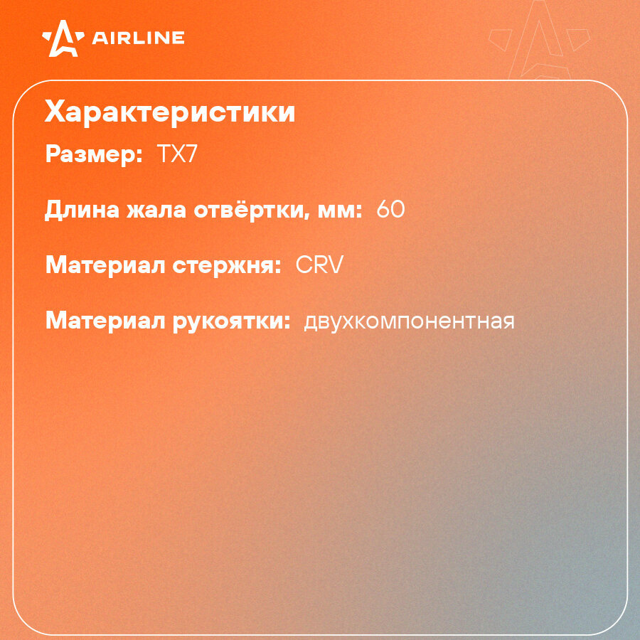Отвертка TORX TX7x60, магнитный наконечник, пласт. подвес ATBX003 AIRLINE интересное: