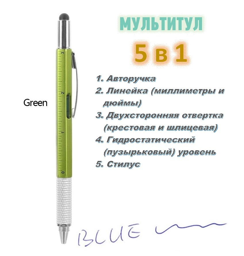Мультитул 5 в 1. Двухсторонняя отвертка с шариковой ручкой, уровнем, линейкой, и стилусом. Зеленый интересное: