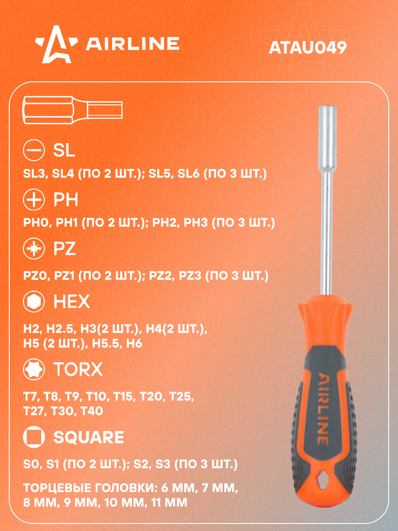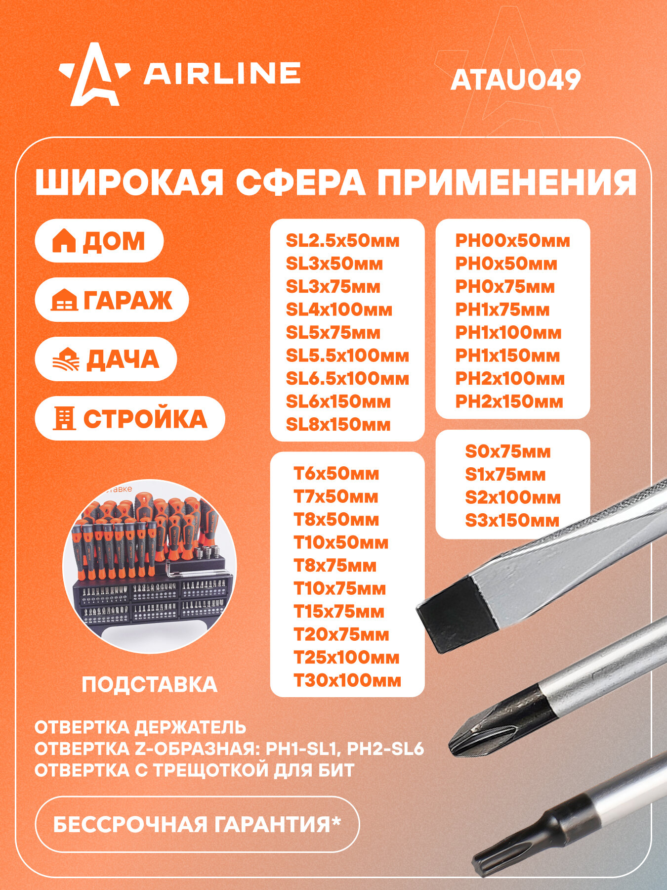 Набор отвёрток, бит и головок 100 пр. в подставке (SL, PH, PZ, HEX, TORX, SQUARE) ATAU049 AIRLINE интересное: