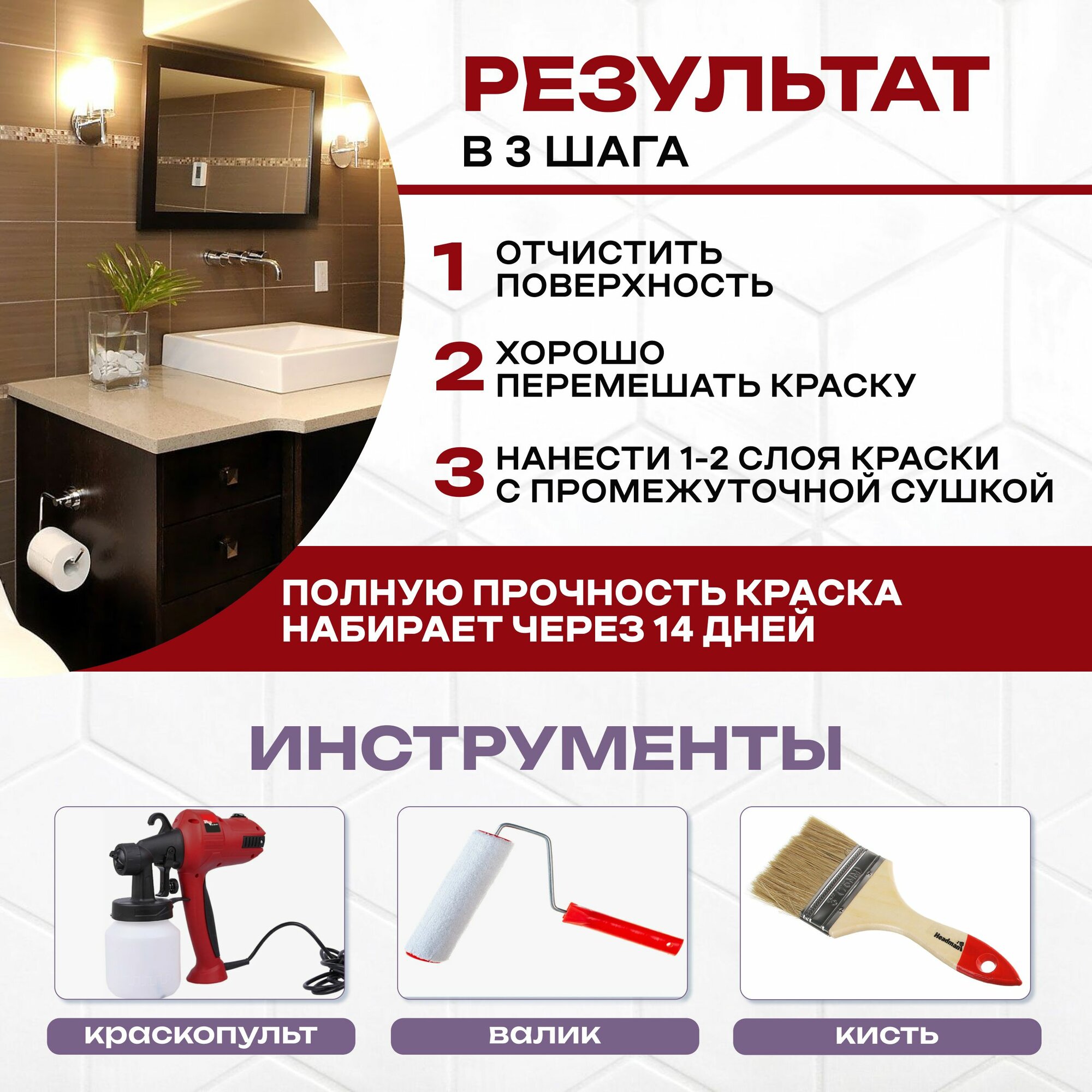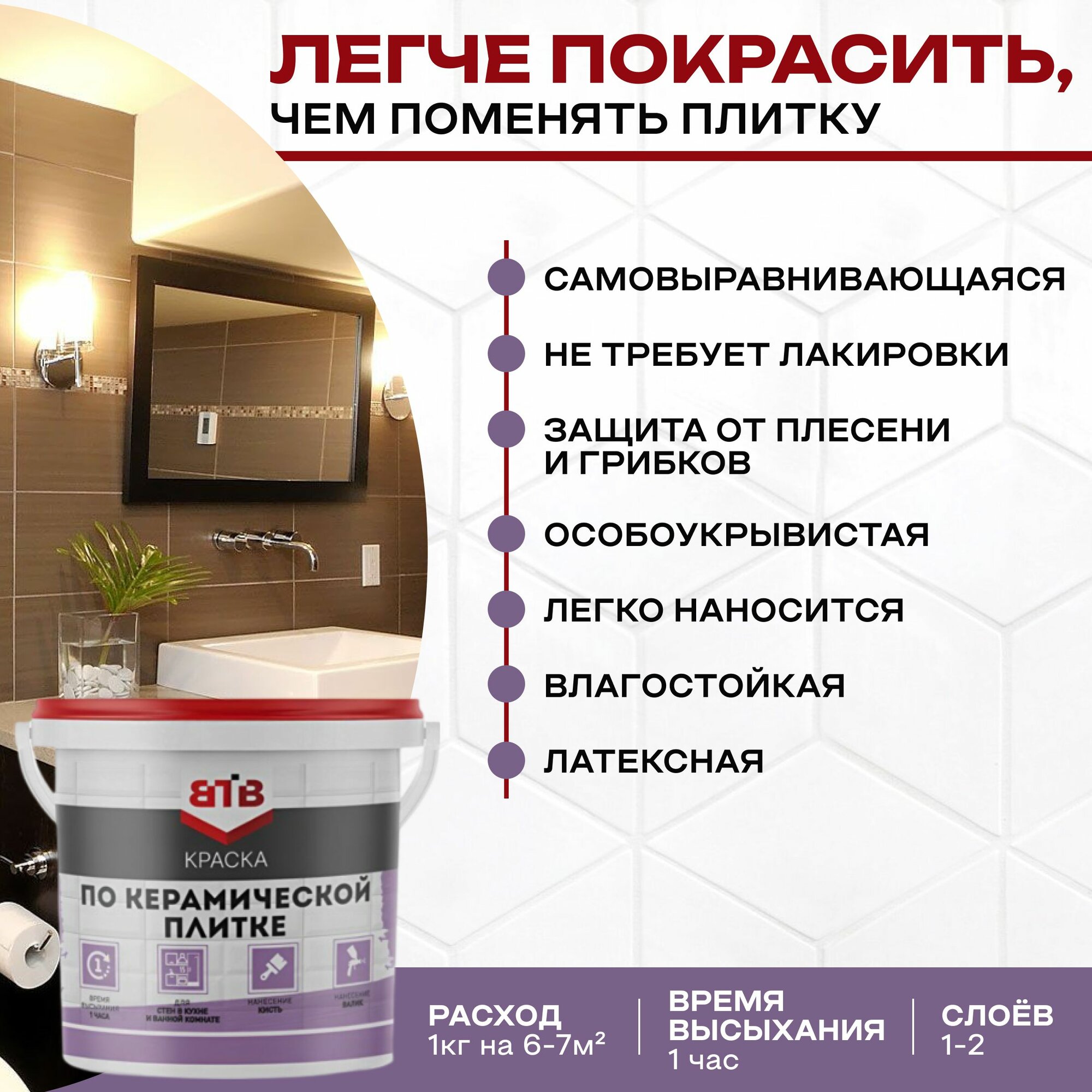 Краска водоэмульсионная ВТВ для ванной комнаты, кафеля и керамической плитки, стен и потолков, моющаяся 1кг Белая