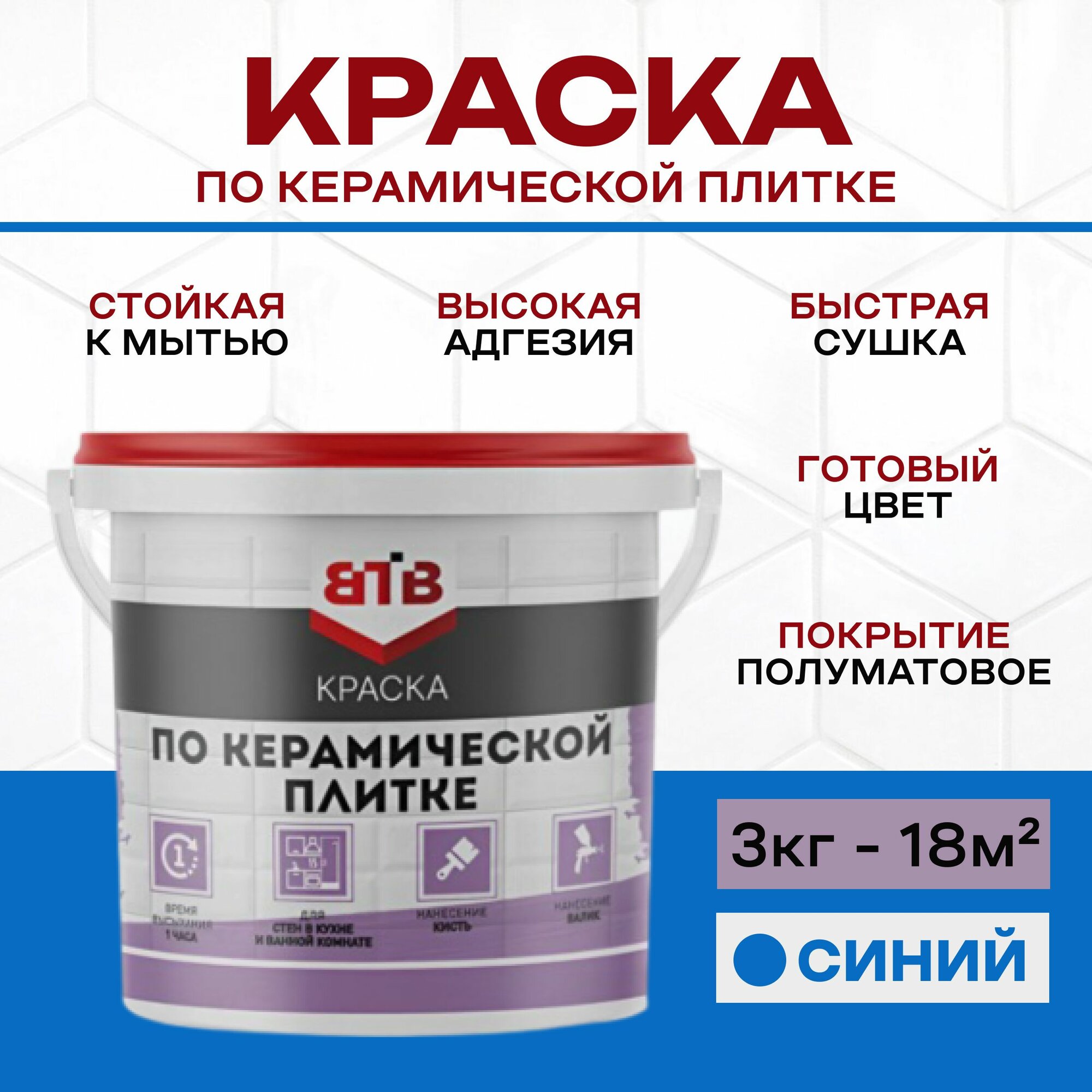 Ниже Вы можете прочитать отзывы на Краска по керамической плитке ВТВ 3кг синяя, ознакомится с подробными характеристиками, посмотреть интересные обзоры и фотографии на Краска по керамической плитке ВТВ 3кг синяя.