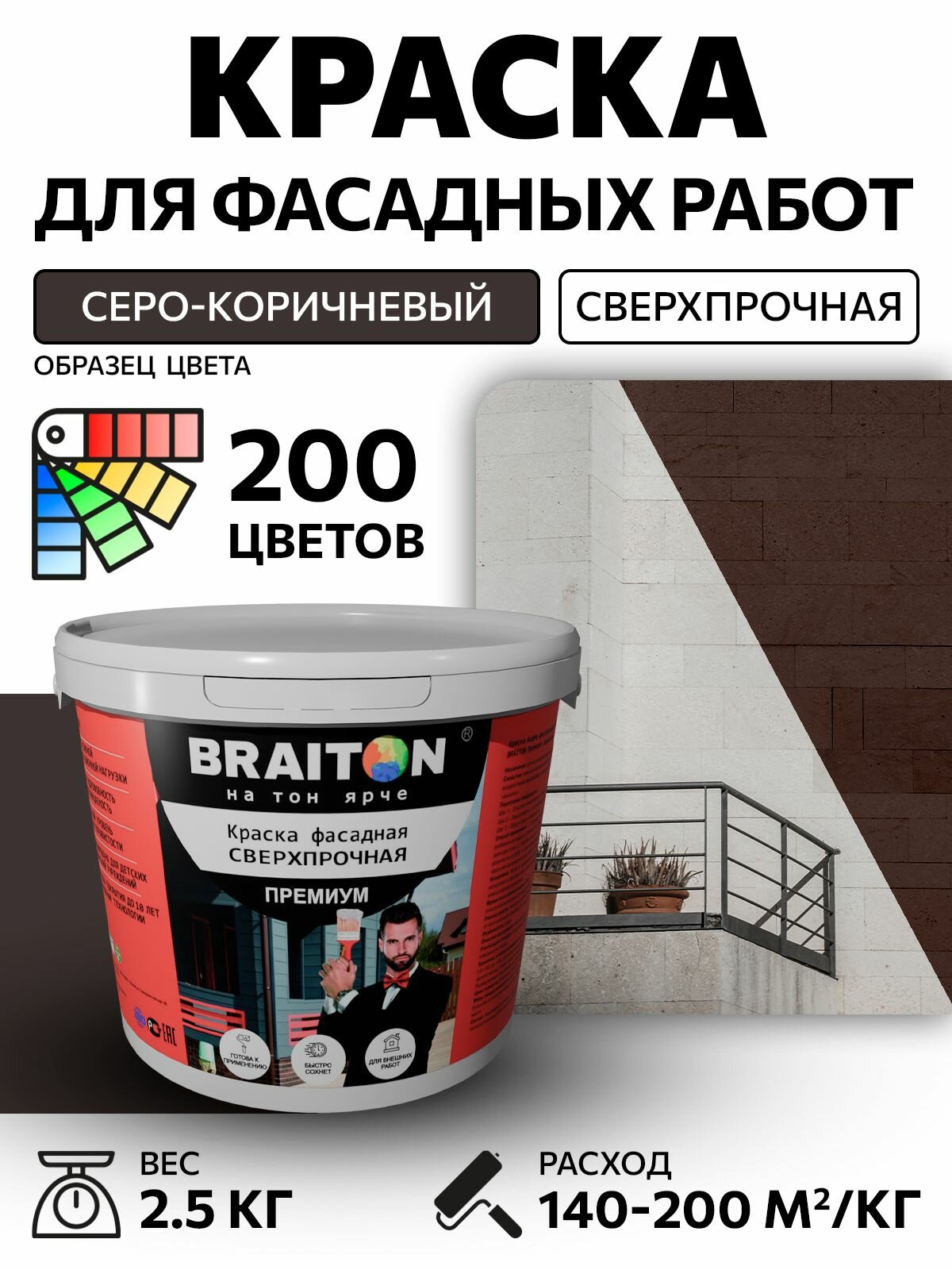 Краска ВД фасадная BRAITON Премиум Сверхпрочная 2,5 кг. Цвет Шоколадно-коричневый RAL 8017 для наружных и внутренних работ для дерева по бетону, для минеральных поверхностей и штукатурке,