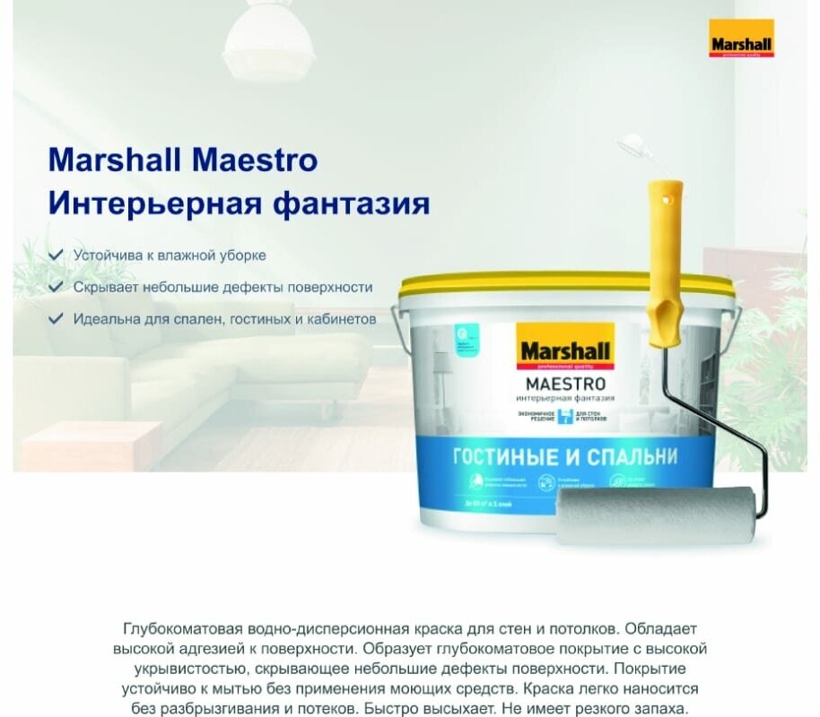Краска интерьерная Marshall Paints Marshall Maestro Интерьерная Фантазия - гостинные и спальни, глубокоматовая белая 9 л.