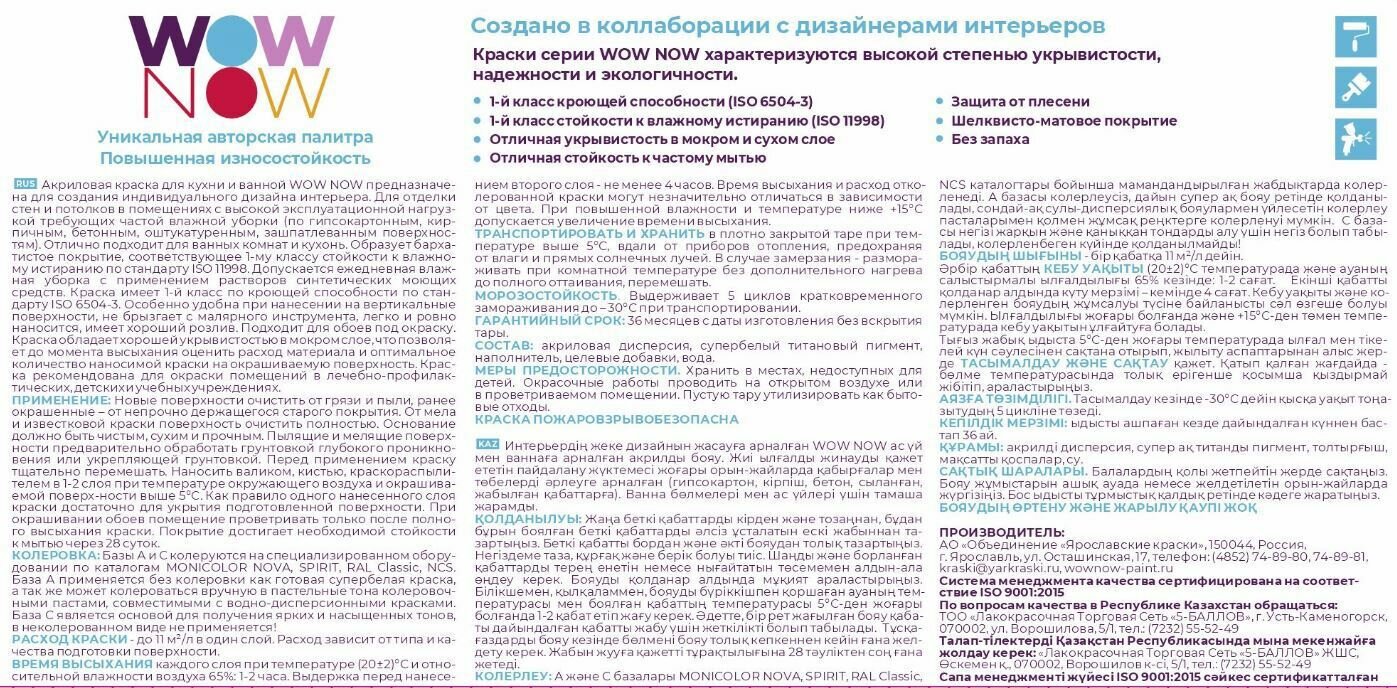 Краска для стен кухни и ванны Wow Now моющаяся полуматовая прозрачная база С 5 л