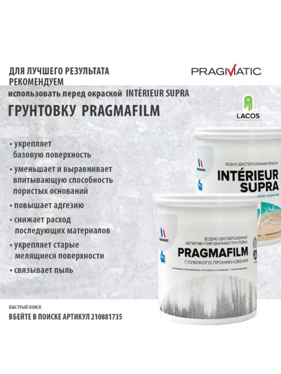 INTERIEUR SUPRA водоэмульсионная экстраматовая краска для стен и потолков, моющаяся, 0.9 л цвет Белый или под колеровку