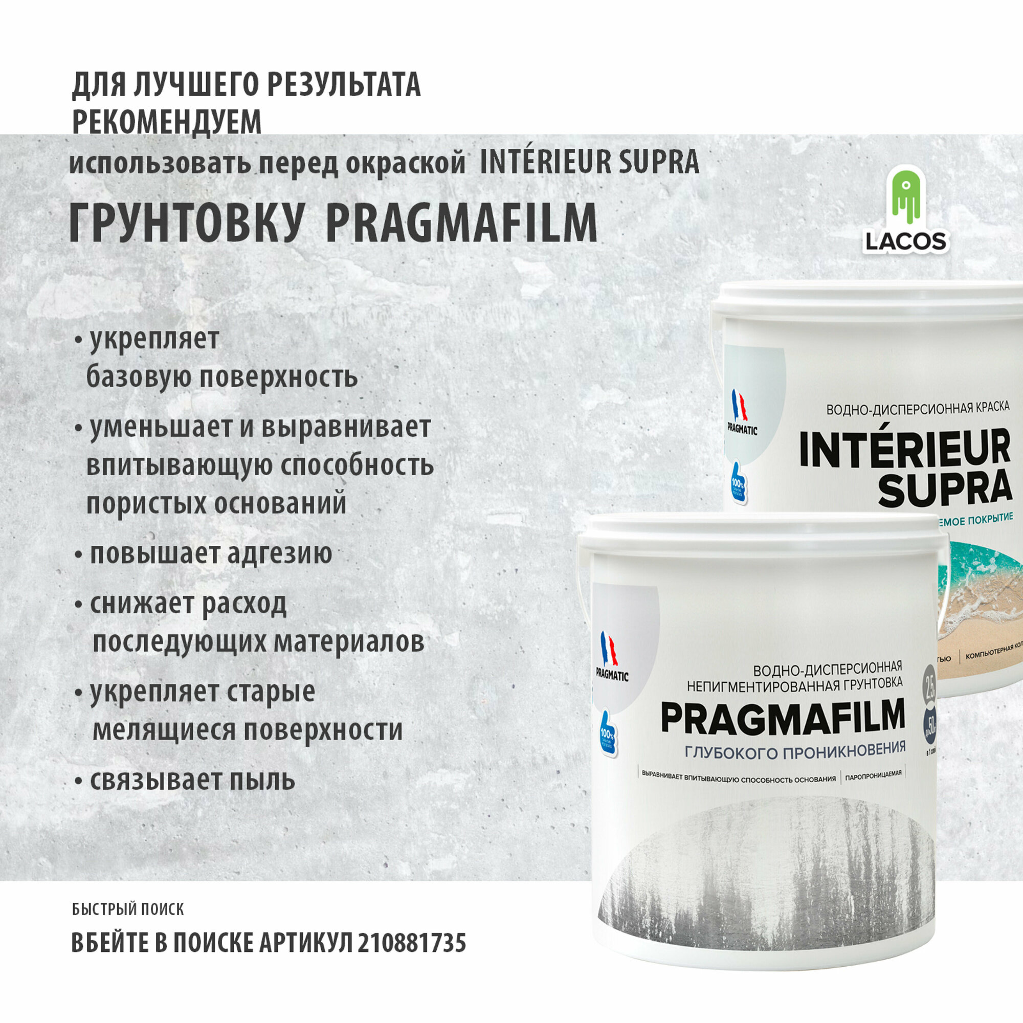 INTERIEUR SUPRA водоэмульсионная экстраматовая краска для стен и потолков, моющаяся, 0.9 л цвет Светло серый 8475