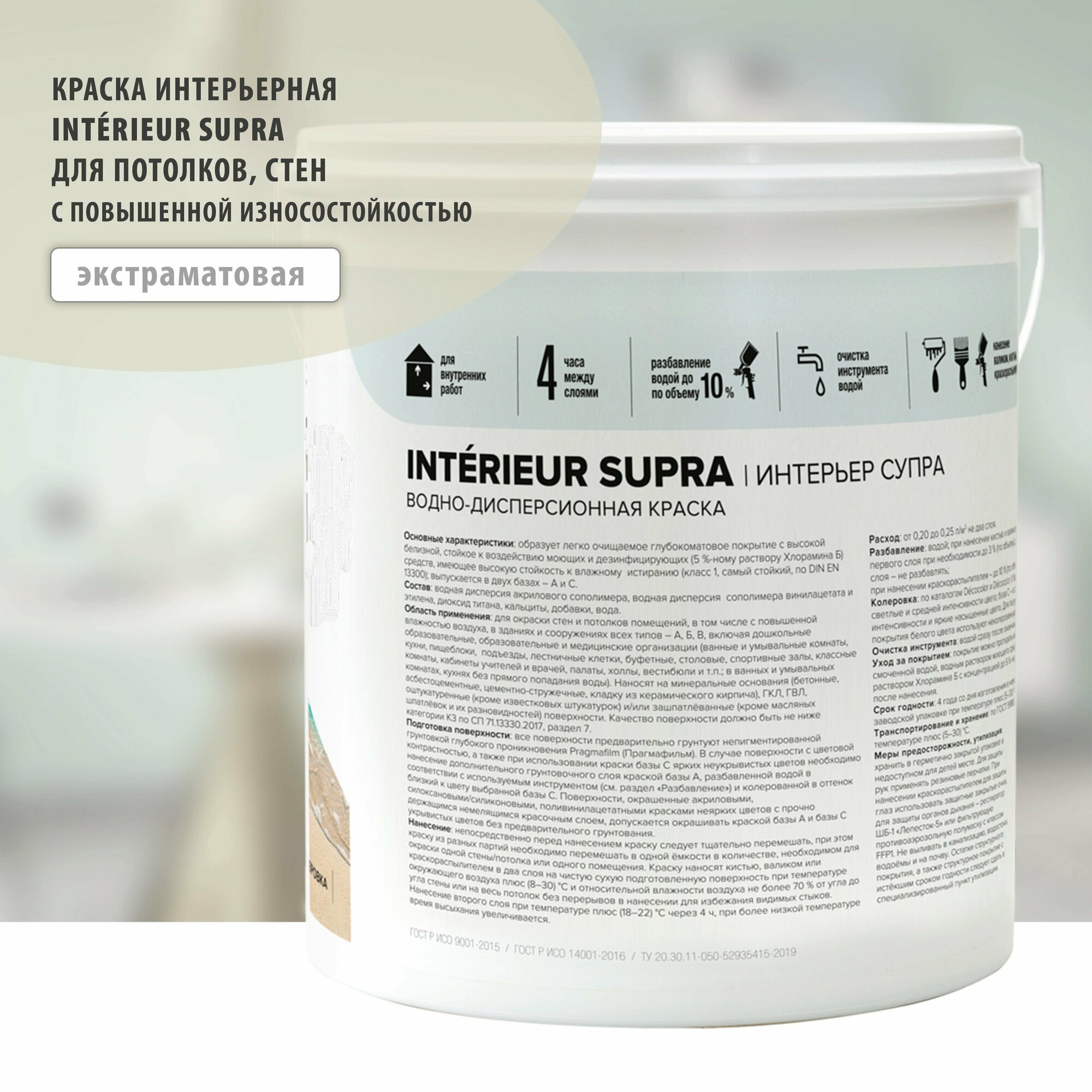 INTERIEUR SUPRA водоэмульсионная экстраматовая краска для стен и потолков, моющаяся, 0.9 л цвет Белый или под колеровку