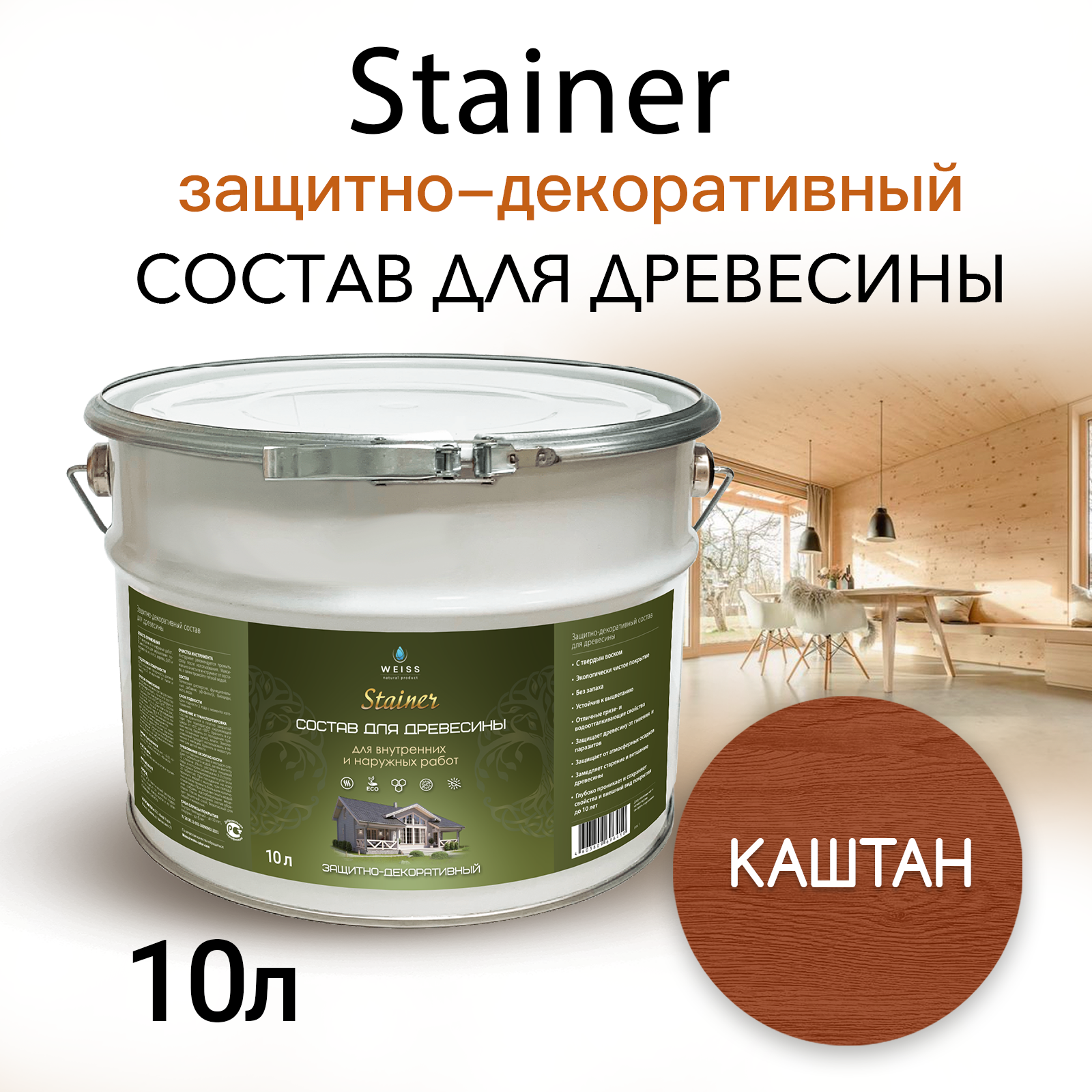 СохранитьStainer 10л Каштан 017, Защитно-декоративный состав для дерева и древесины, Стайнер, пропитка, защитная лазурь интересное: