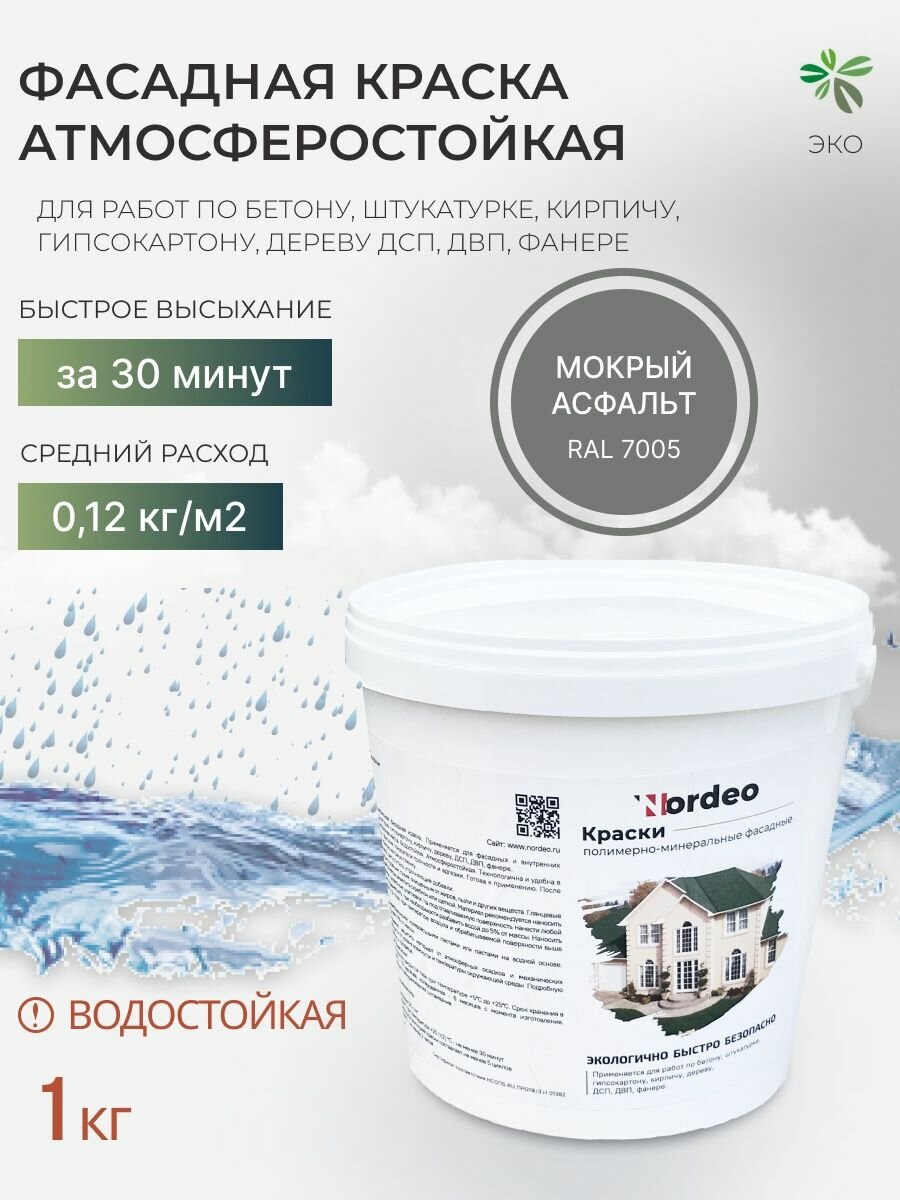 Краска для фасада, дома, работ по кирпичу, штукатурке Nordeo водостойкая, без запаха, цвет - Мокрый асфальт, 15 кг
