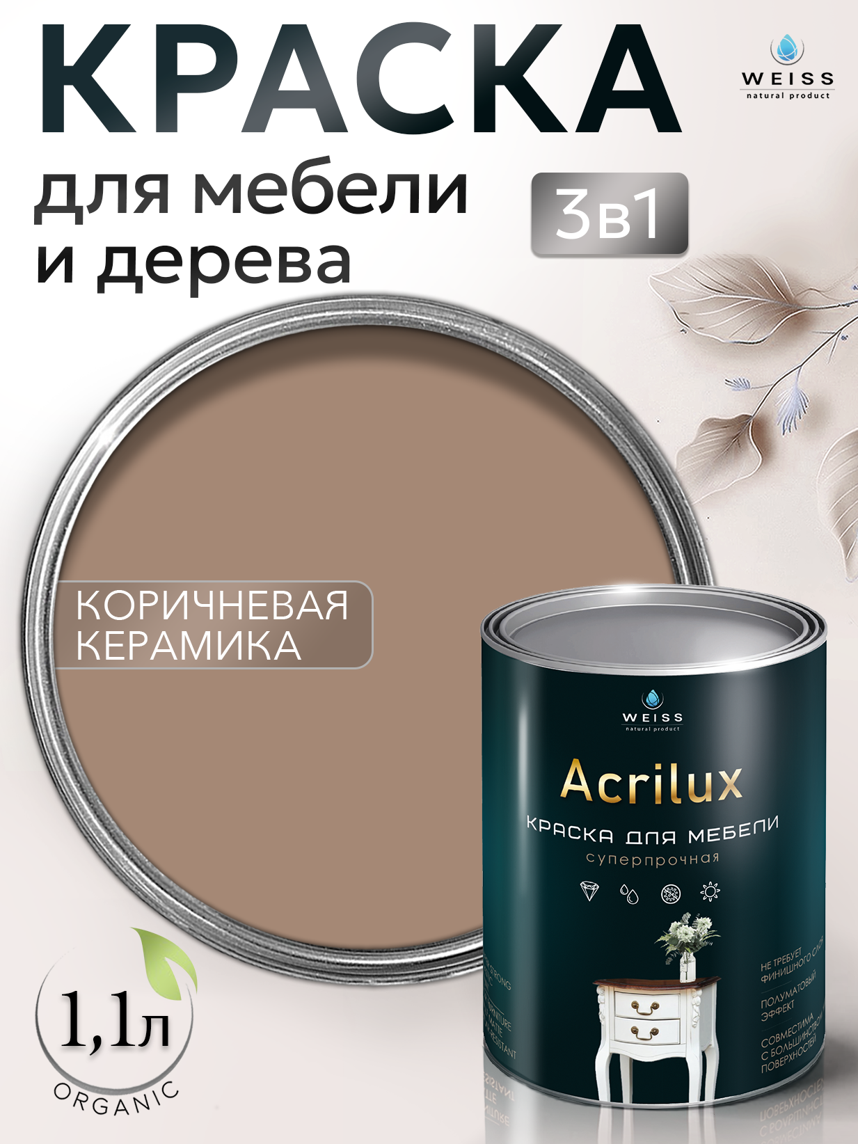 Купить Краска для мебели и дерева, без запаха, Коричневая керамика, 1,1л, Weiss Natural Product