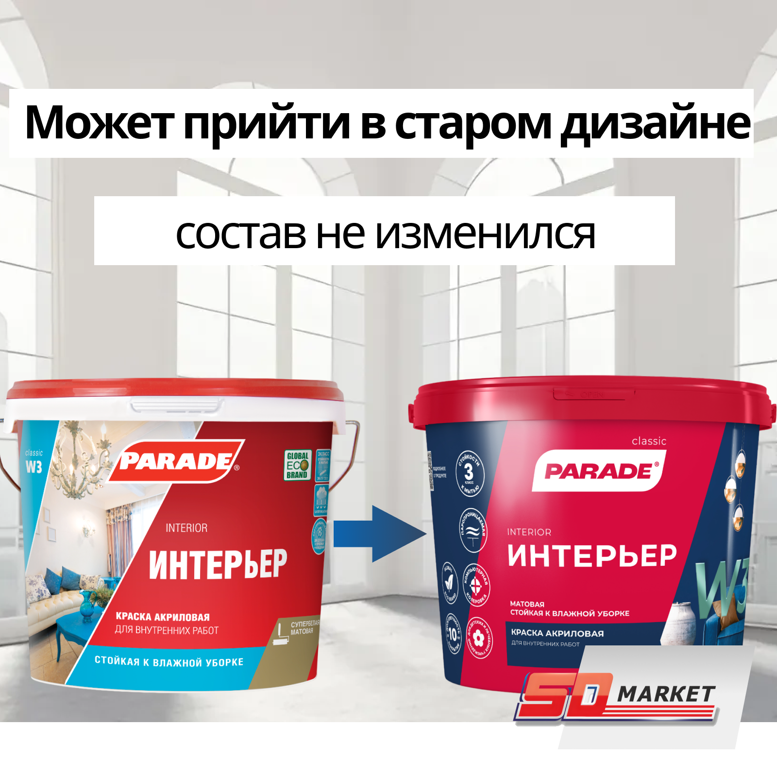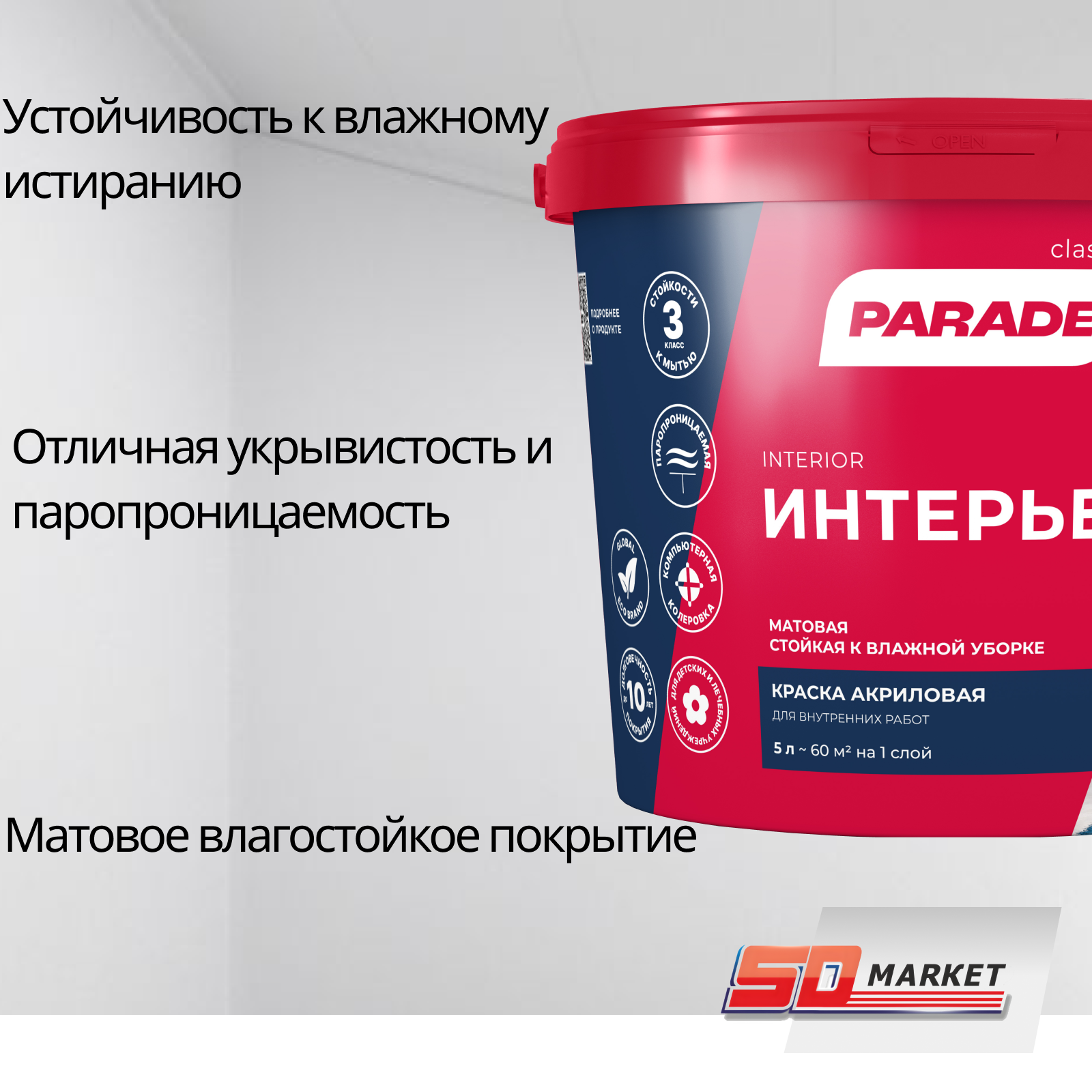 Краска Parade W3, Интерьерная, Акриловая, Матовое покрытие, 2.5 л, 4 кг