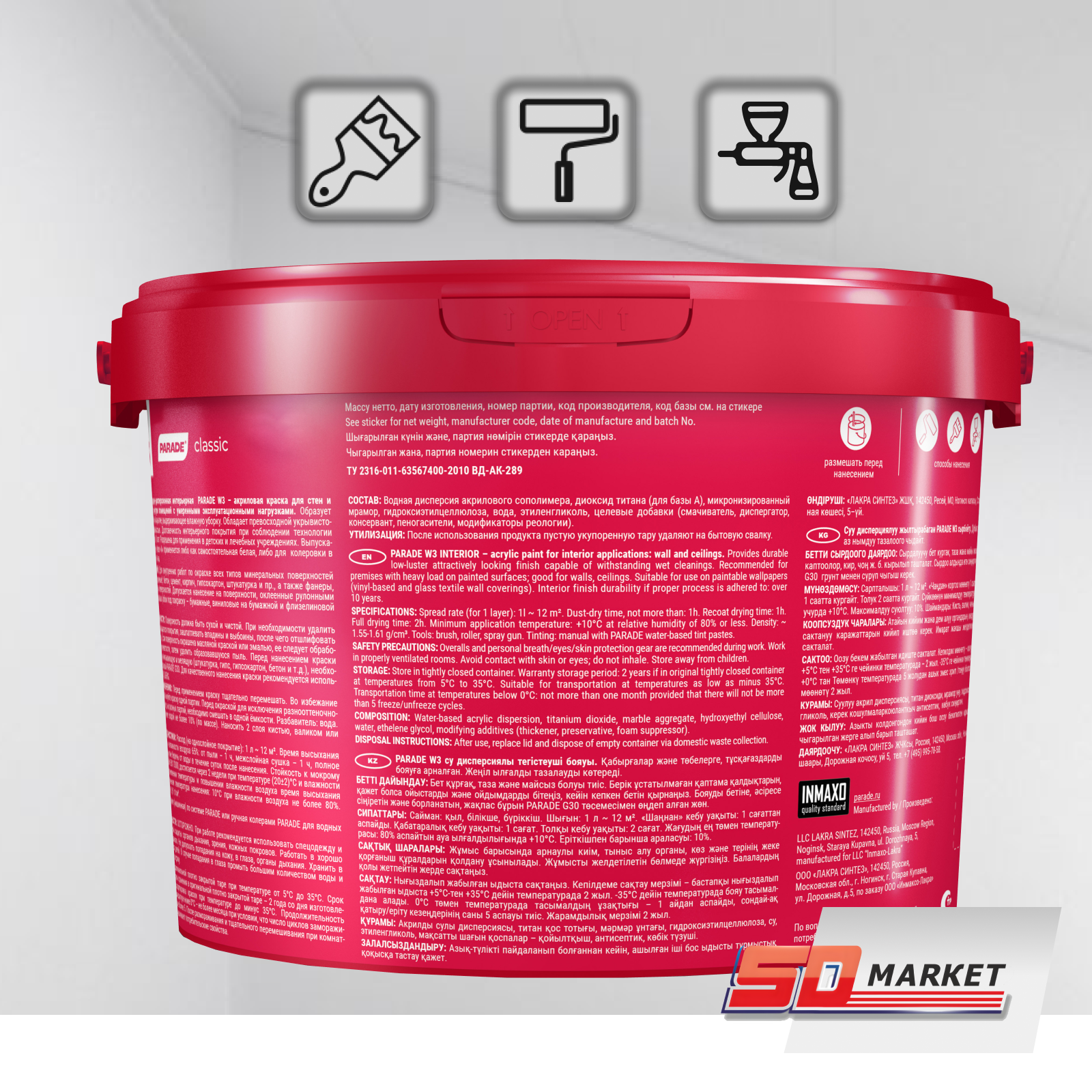 Краска Parade W3, Интерьерная, Акриловая, Матовое покрытие, 9 л, 14,1 кг