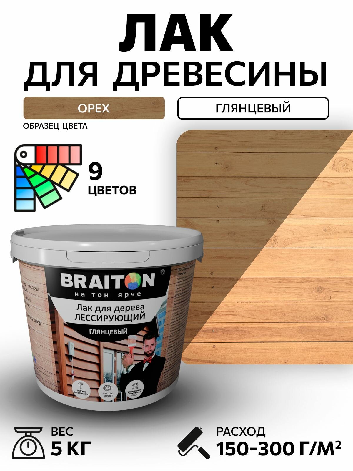 Лак акриловый Braiton для дерева лессирующий глянцевый 5 кг. Цвет Сосна быстросохнущий без запаха, для кухонных фасадов, для дерева