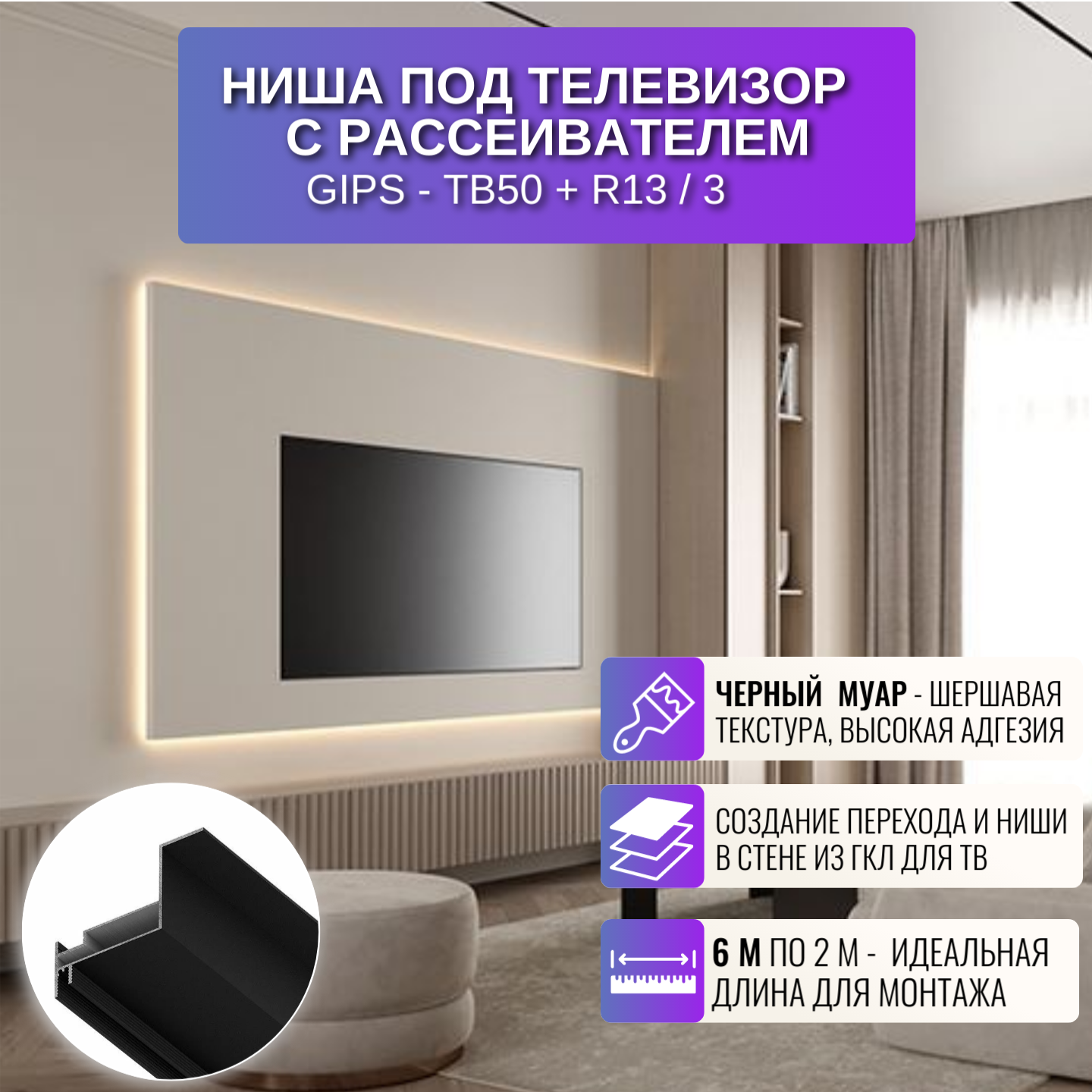 Ниша с рассеивателем для создании ниши под телевизор в стене, 2 м, 3 шт, цвет черный интересное: