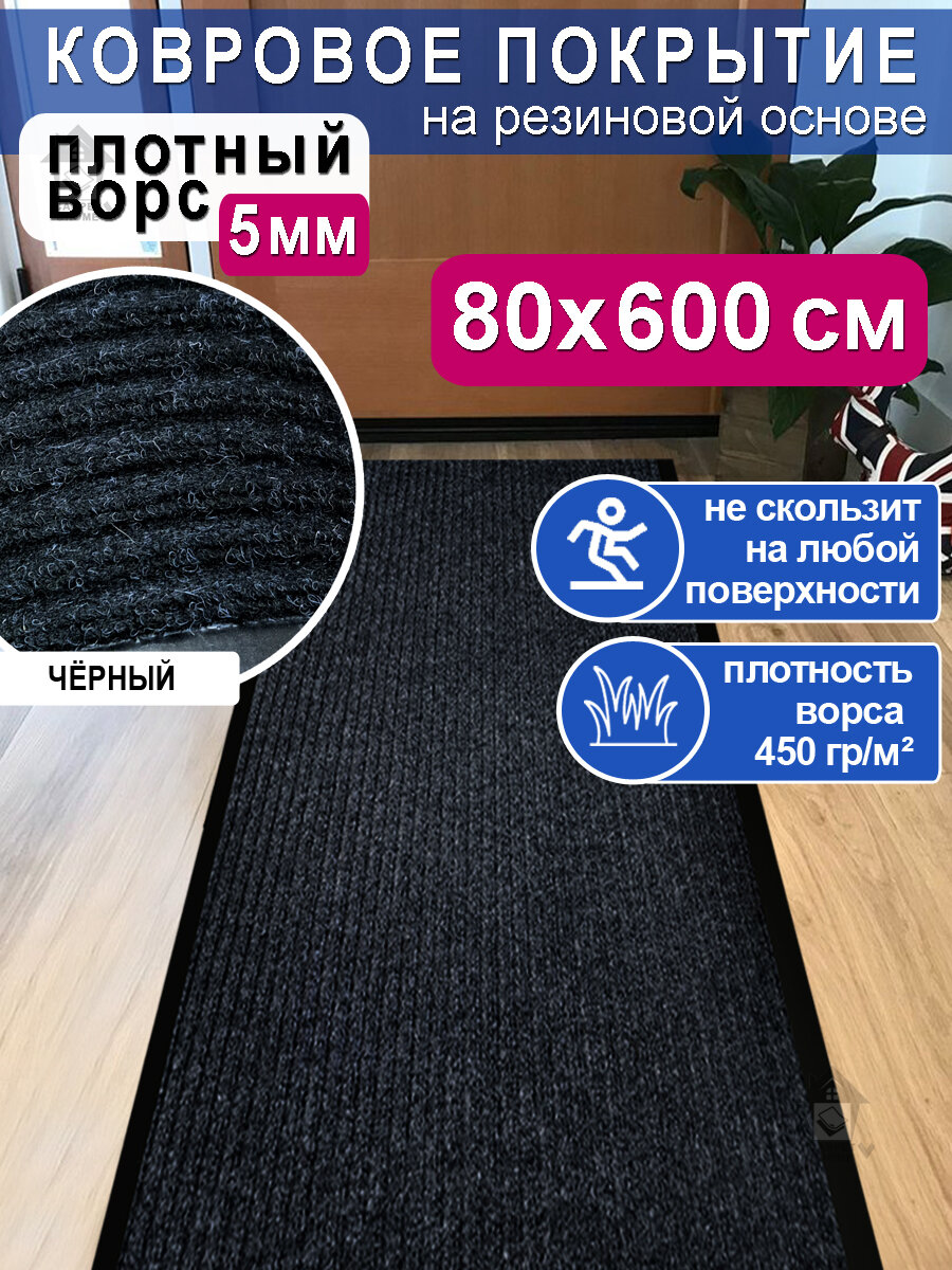Ковролин на резиновой основе 80х450 см для дома и офиса Черный