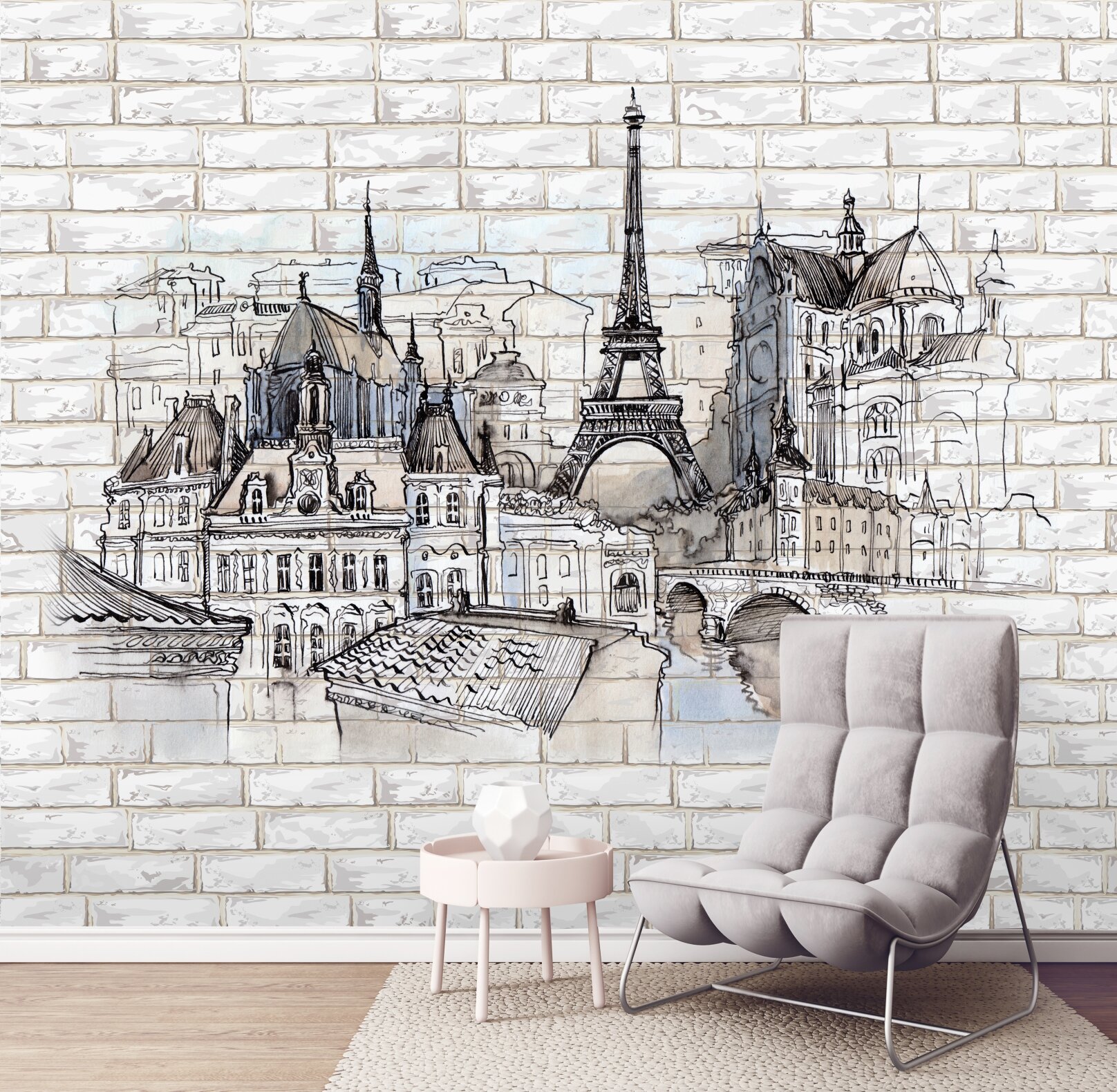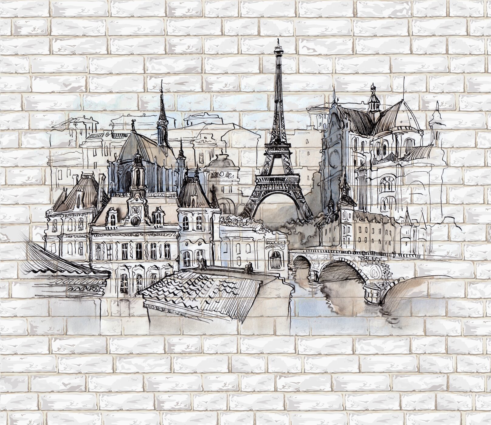 Фотообои "Акварельный Париж на фоне кирпичной стены" 300*260 см. /Фотообои для спальни, гостиной, кухни интересное: