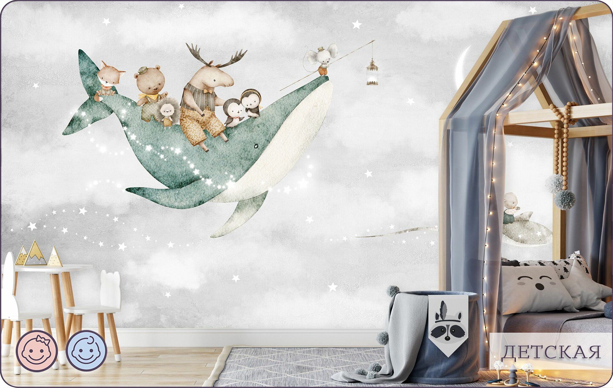 Фотообои на стену флизелиновые 3d Детские Животные Луна Звезды 300х270 см Bartonwall K302