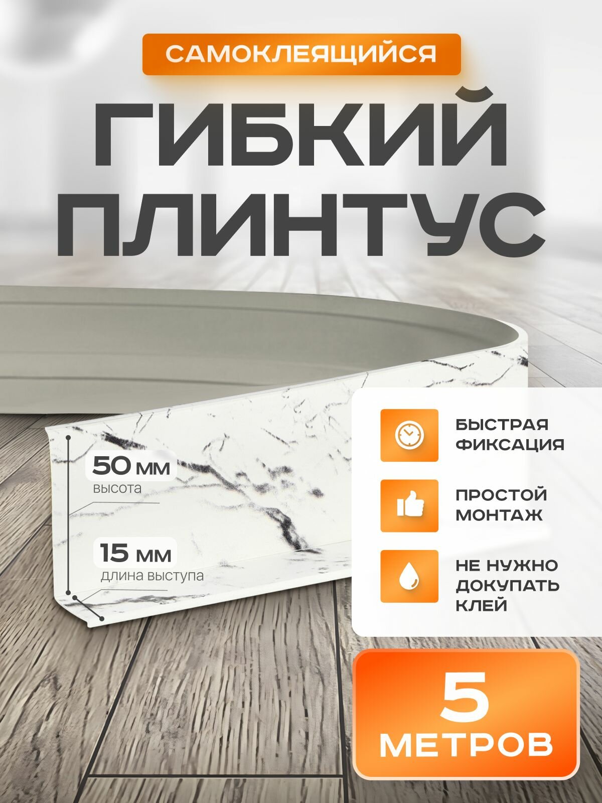 СохранитьПлинтус гибкий напольный самоклеящийся, 65мм х 5м, белый мрамор , гибкий плинтус для пола. интересное: