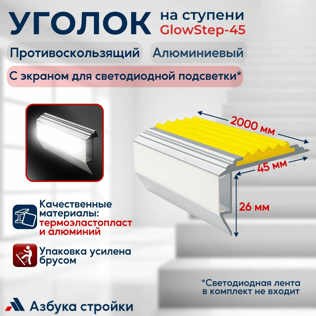 Купить Алюминиевый угол-порог с резиновой вставкой и экраном для светодиодной подсветки GlowStep, 45мм, цвет вставки желтый, 2 м