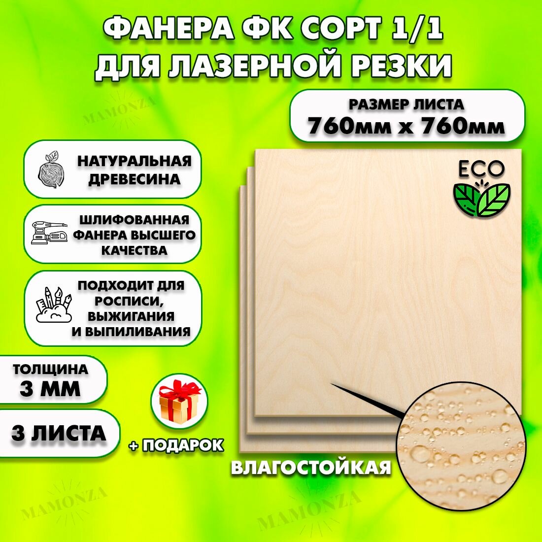 Купить Фанера для лазерной резки и гравировки, Строительная, Мебельная, Размер 760х760, 3 листа, Толщина 3мм, сорт 1/1