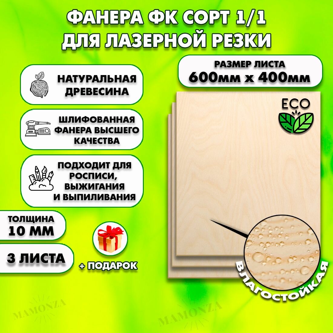 Купить Фанера для лазерной резки и гравировки, Строительная, Мебельная, Размер 600х400, 3 листа, Толщина 10мм, сорт 1/1