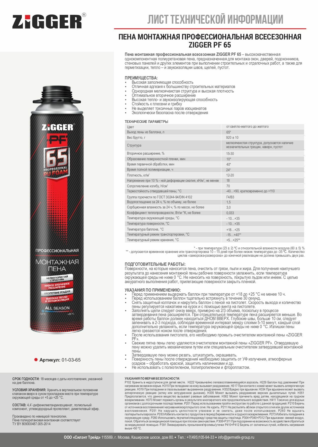 Монтажная пена ZIGGER PF 65л проф. всесезонная, 850 мл, 920 г интересное: