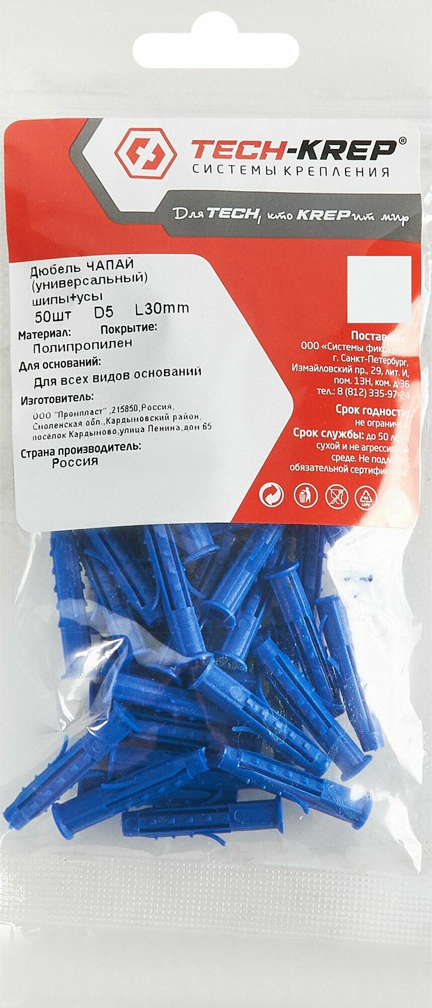 Дюбель распорный для полнотелых материалов Tech-Krep, 5x30 мм, полипропилен, 50 шт. интересное: