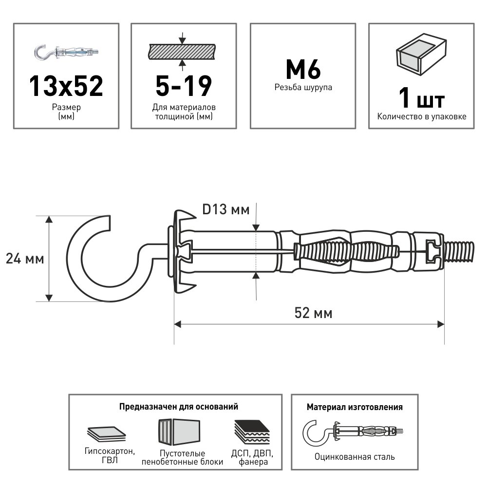 Дюбель Молли c S-крюком FIXBERG 13х52 мм М6 интересное:
