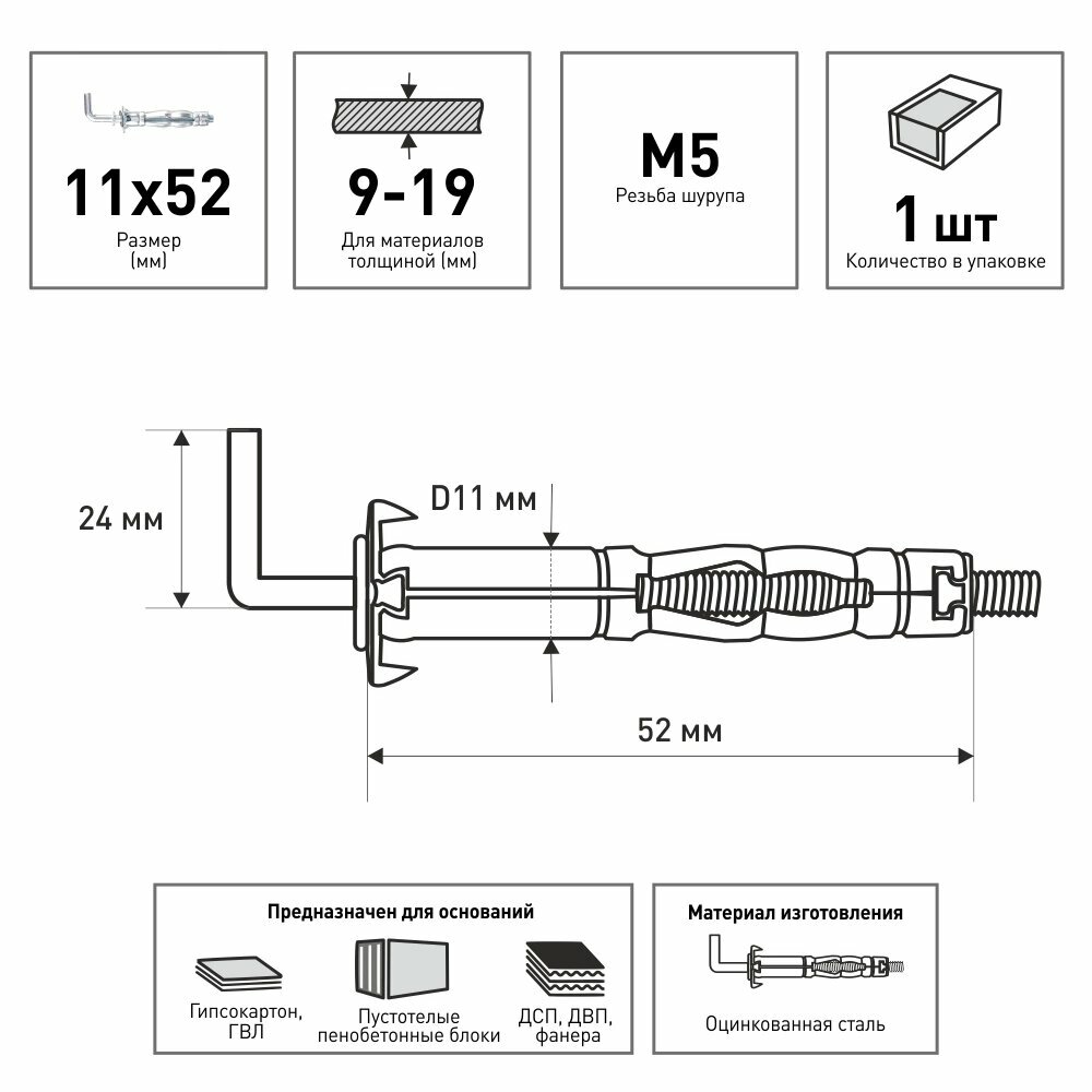 Дюбель Молли c Г-крюком FIXBERG 11х52 мм М5 интересное: