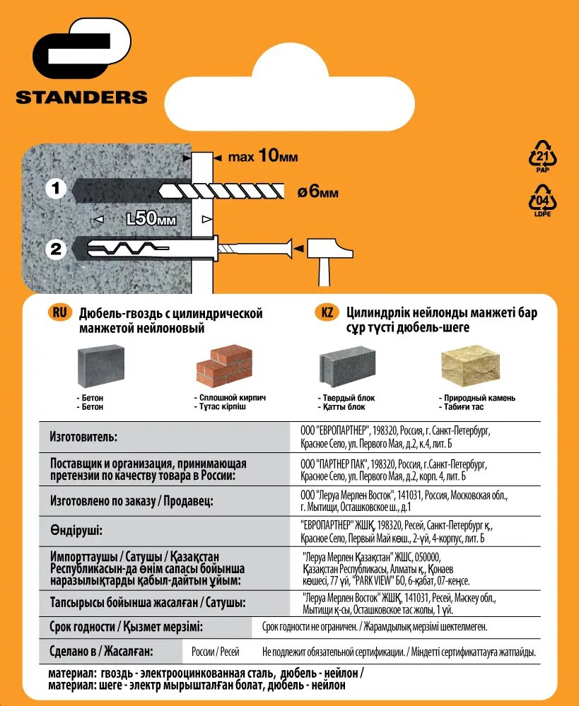Дюбель-гвоздь Standers с цилиндрическим бортиком нейлоновый серый 6x40 мм 10 шт. интересное: