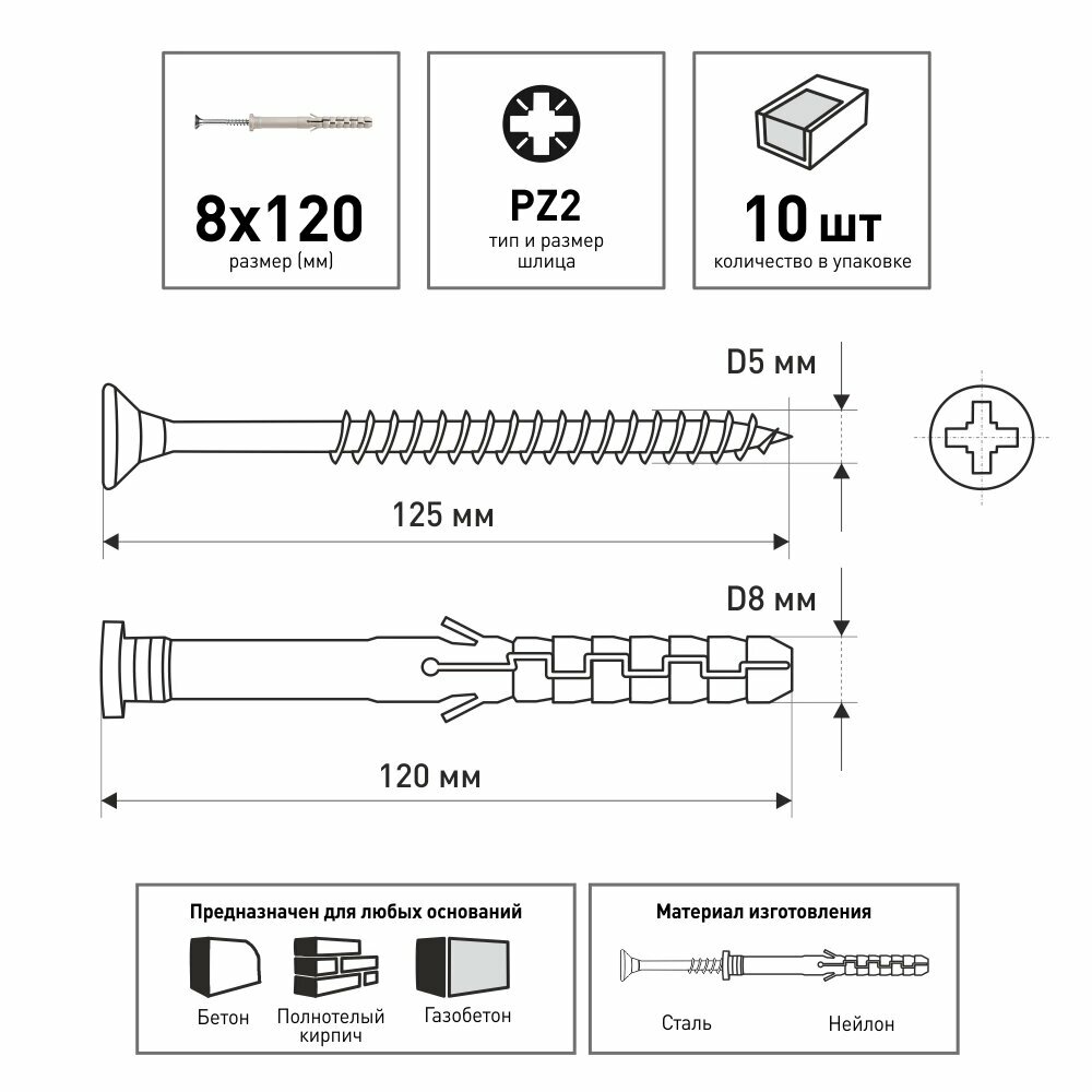 Дюбель распорный для сквозного монтажа европартнер 8х120 мм с шурупом 5х120 мм 10 шт интересное: