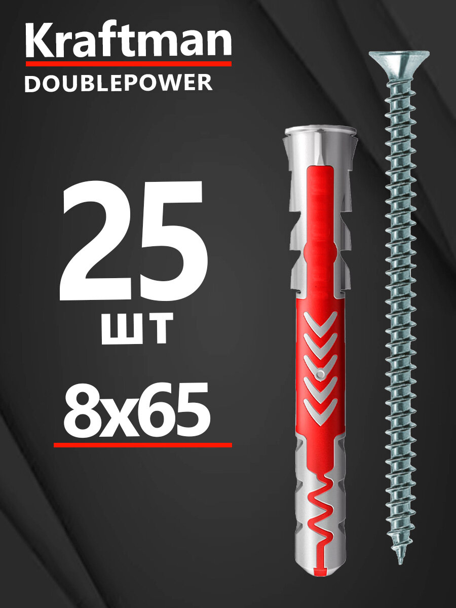 Дюбель универсальный 8х65 DOUBLEPOWER крафтман с саморезом, 25 штук интересное: