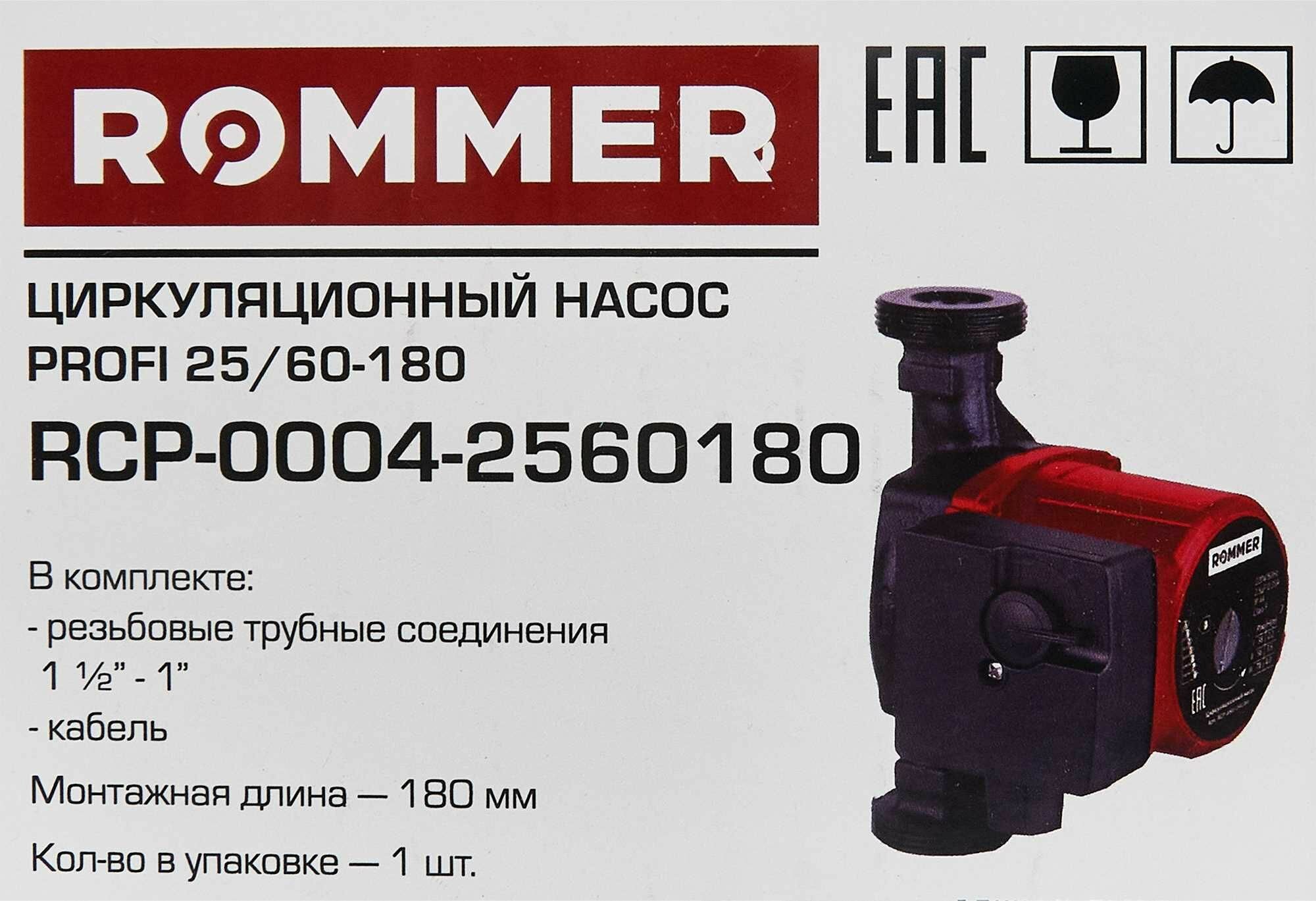Насос циркуляционный Rommer Profi 25/60-180, 93 Вт, напор 6 м, 4.07 л/мин, кабель 1.3 м Rommer интересное: