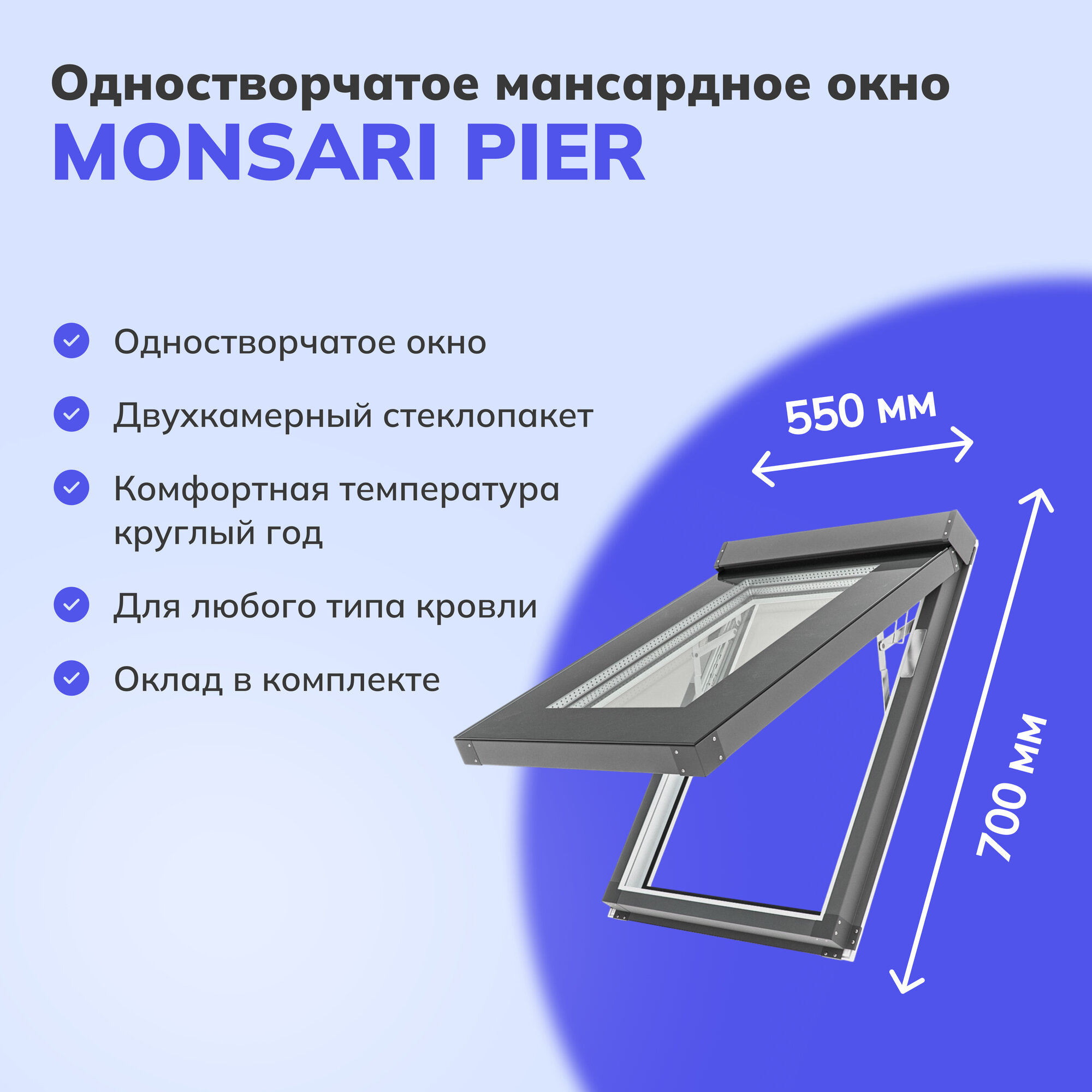 Мансардное окно Monsari Pier из профиля Rehau 550x700 мм (ШхВ), глухое, с окладом для монтажа