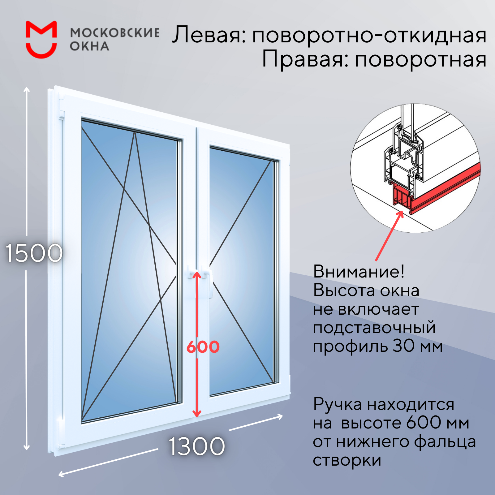 Окно 1350х600 мм Двухстворчатое тип1 (одна створка поворотно откидная правая) Novotex Techno 58 1 камера