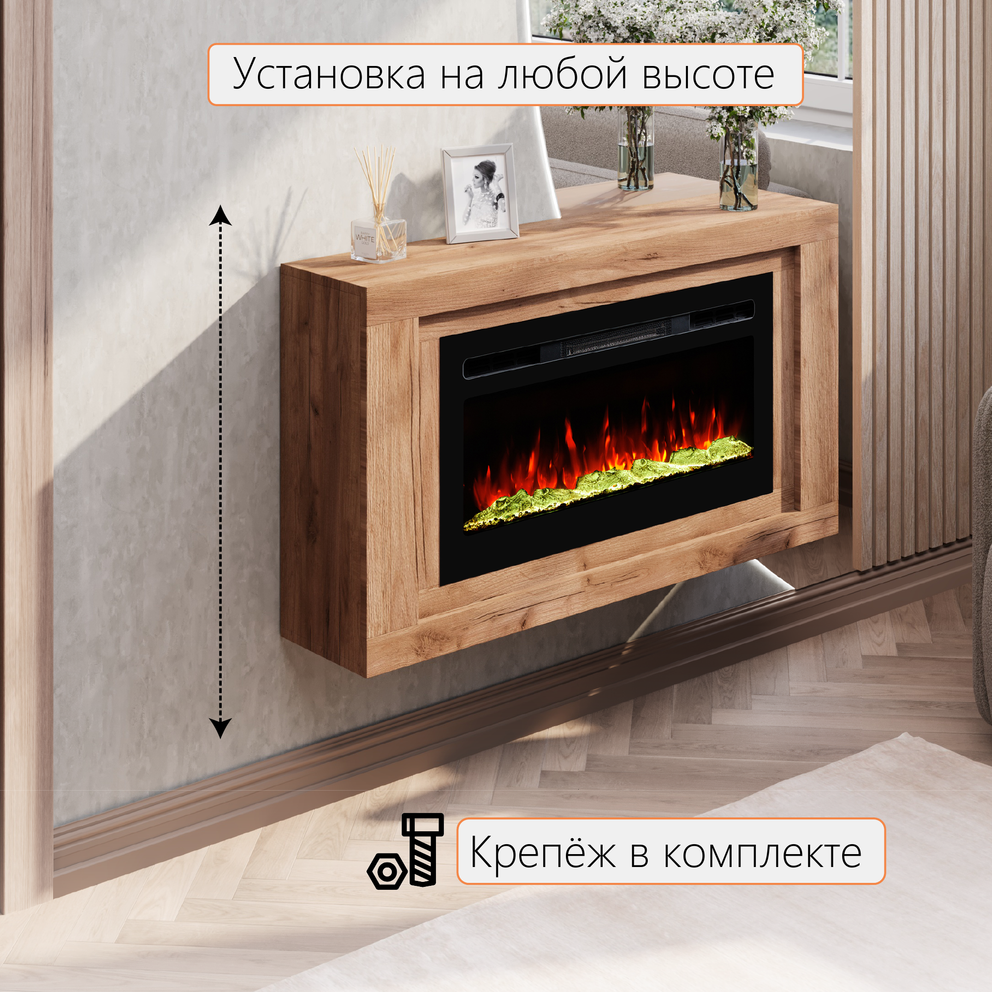 Электрический камин навесной ELEKAM Pulsar31 с очагом и порталом, обогревом и имитацией живого огня интересное: