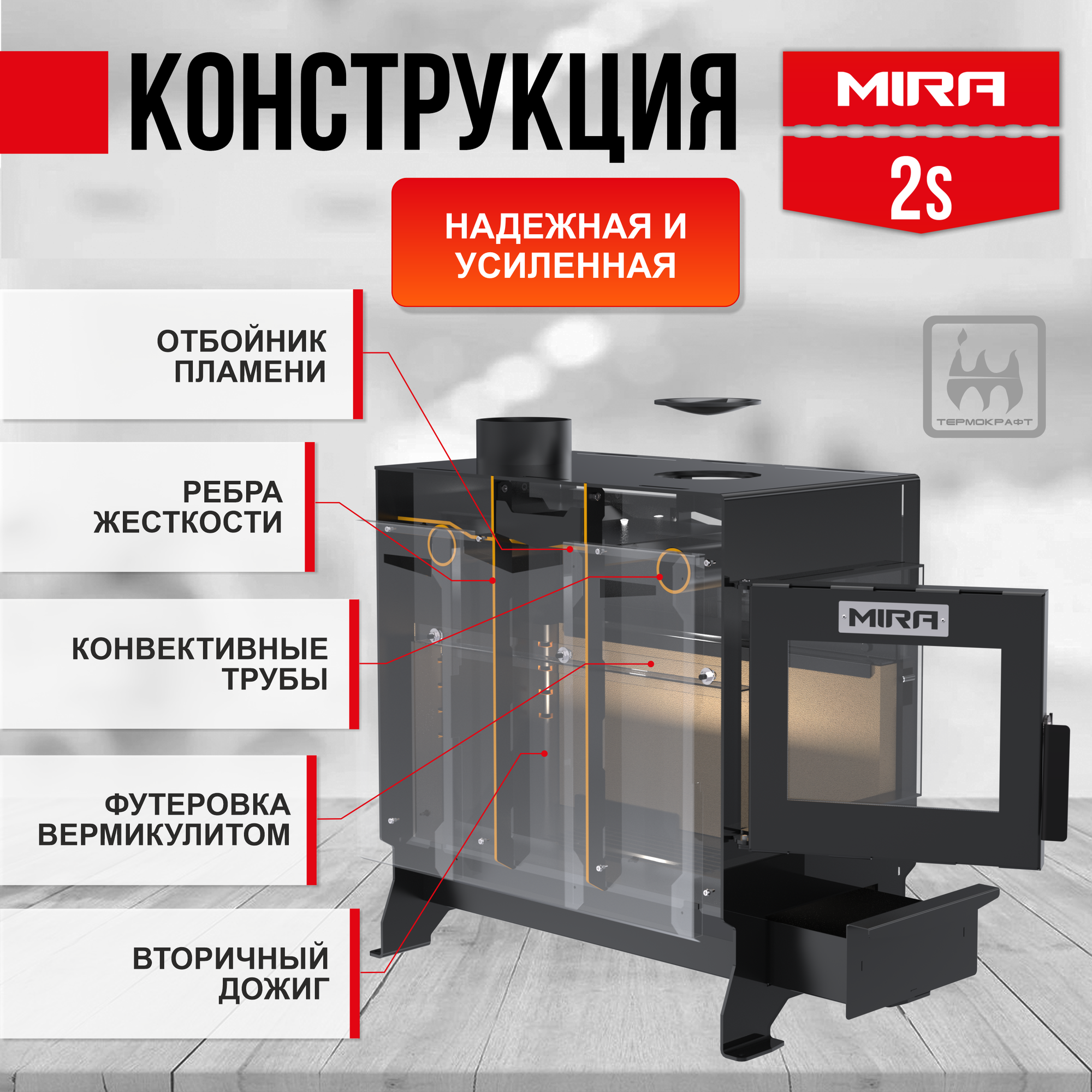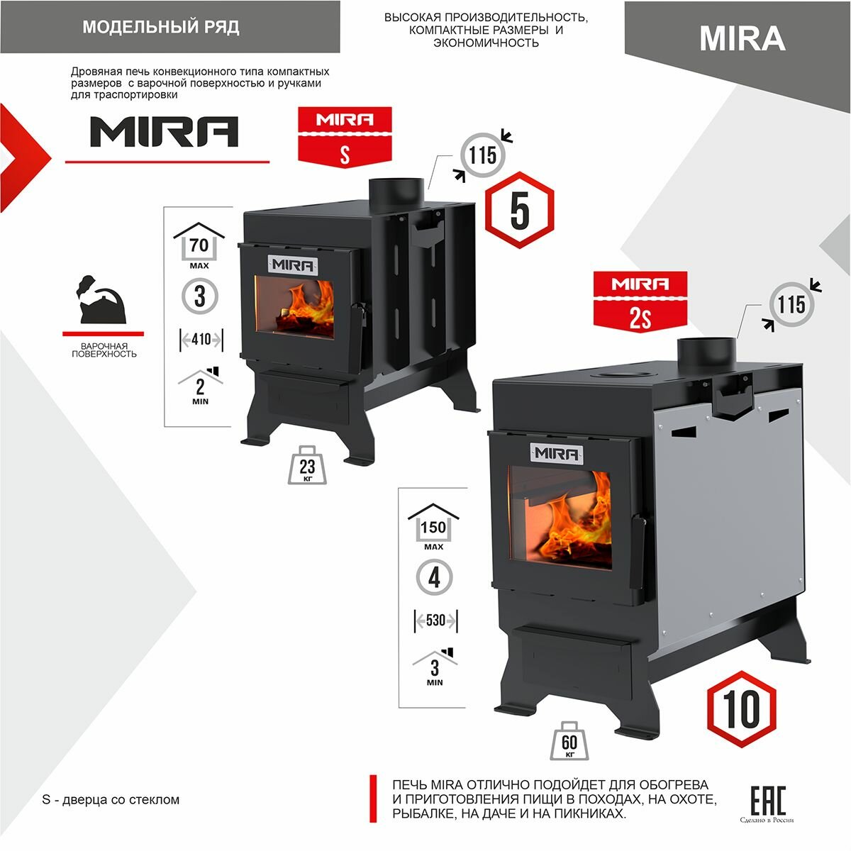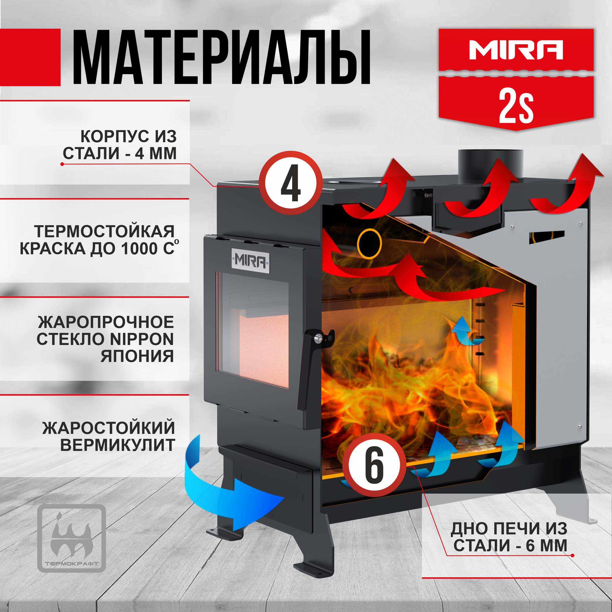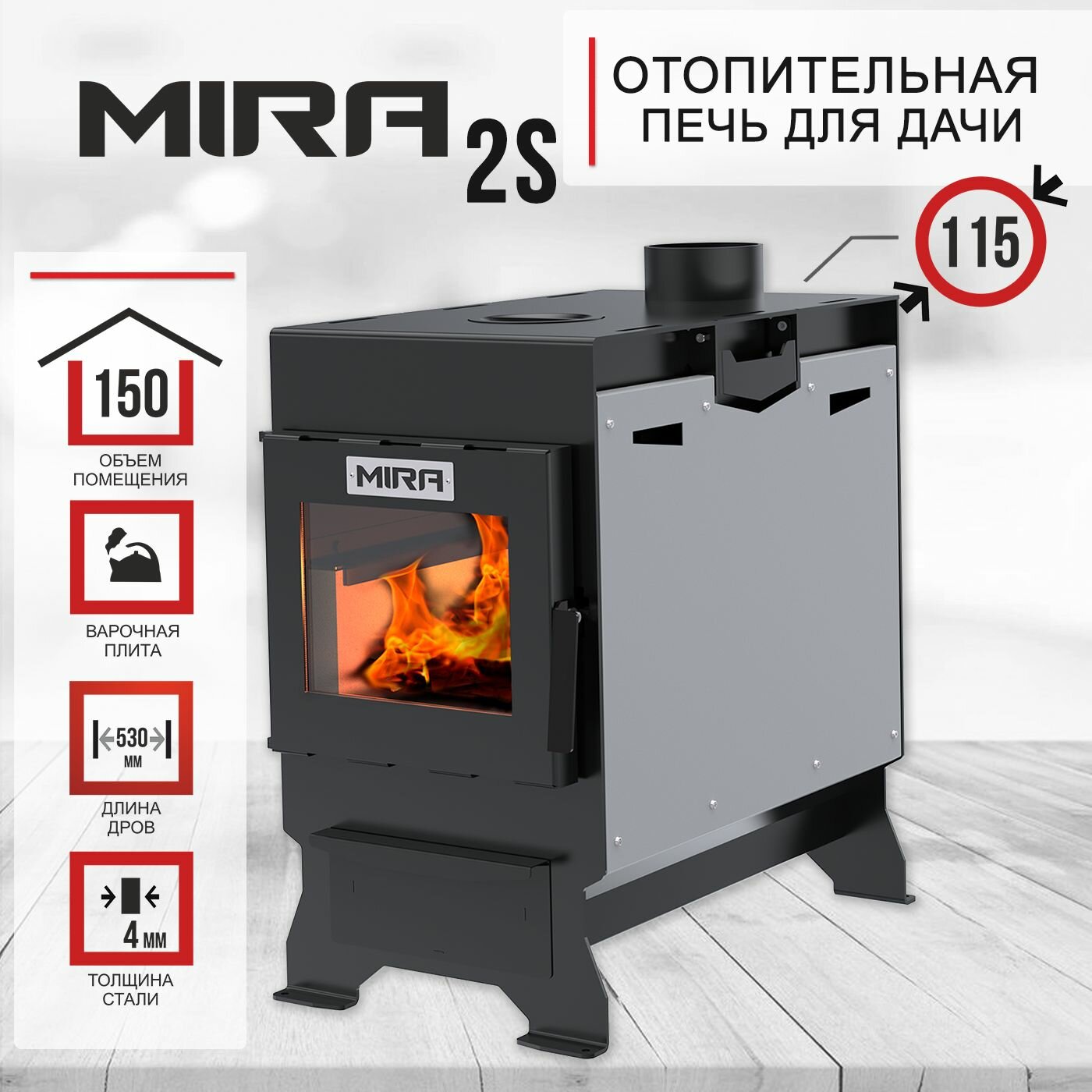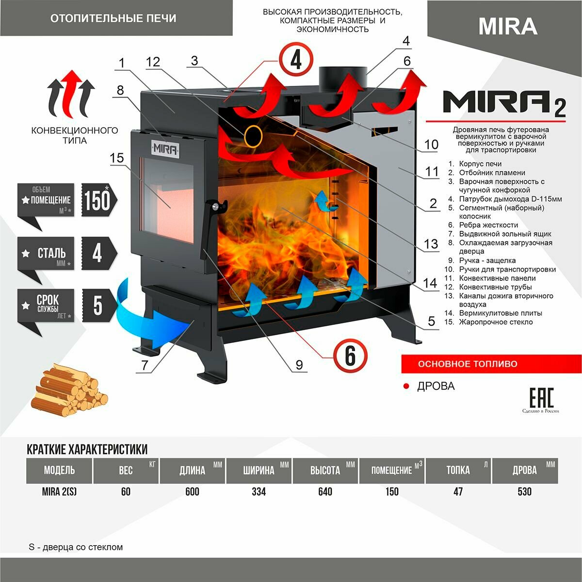 Печь отопительная MIRA 2S стальная 10 кВт дверца со стеклом 150 м3, футеровка вермикулит, с эффектом живого огня интересное: