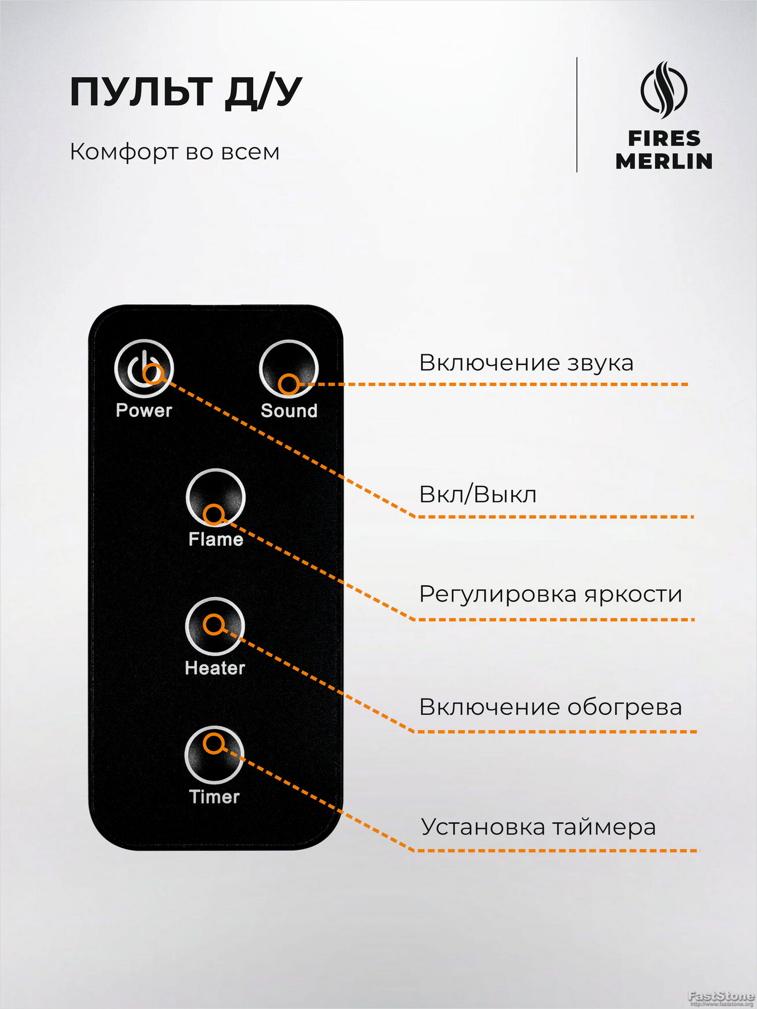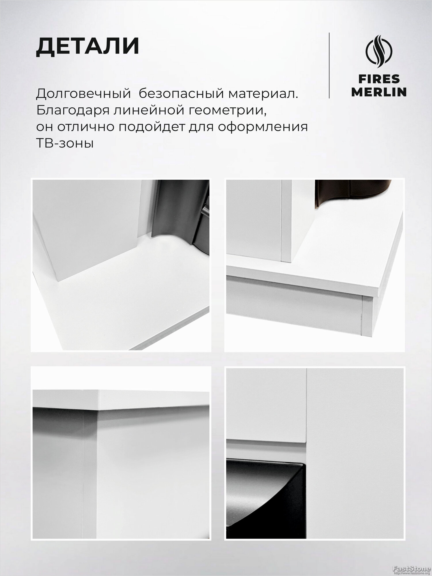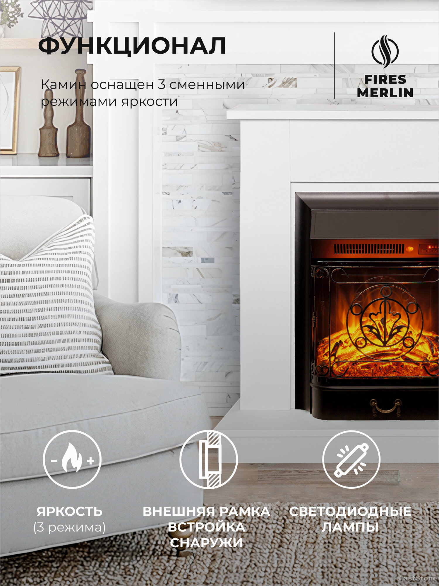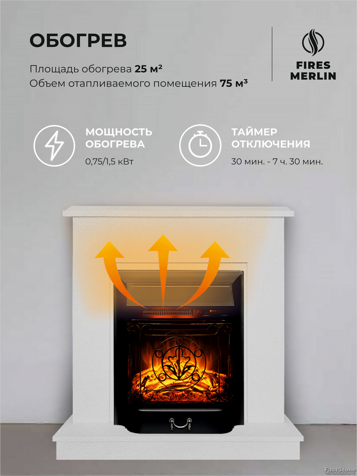 Камин электрический Fires Merlin Stockholm 50 белый c очагом Topaz 50 напольный, имитация звука и пламени, пульт