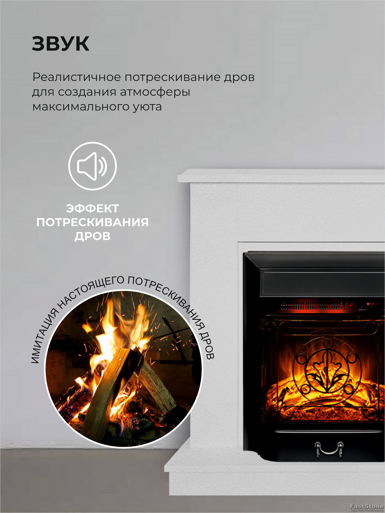 Электрокамин Fires Merlin Nord L белый напольный с очагом, звук потрескивания дров, обогрев, имитация пламени