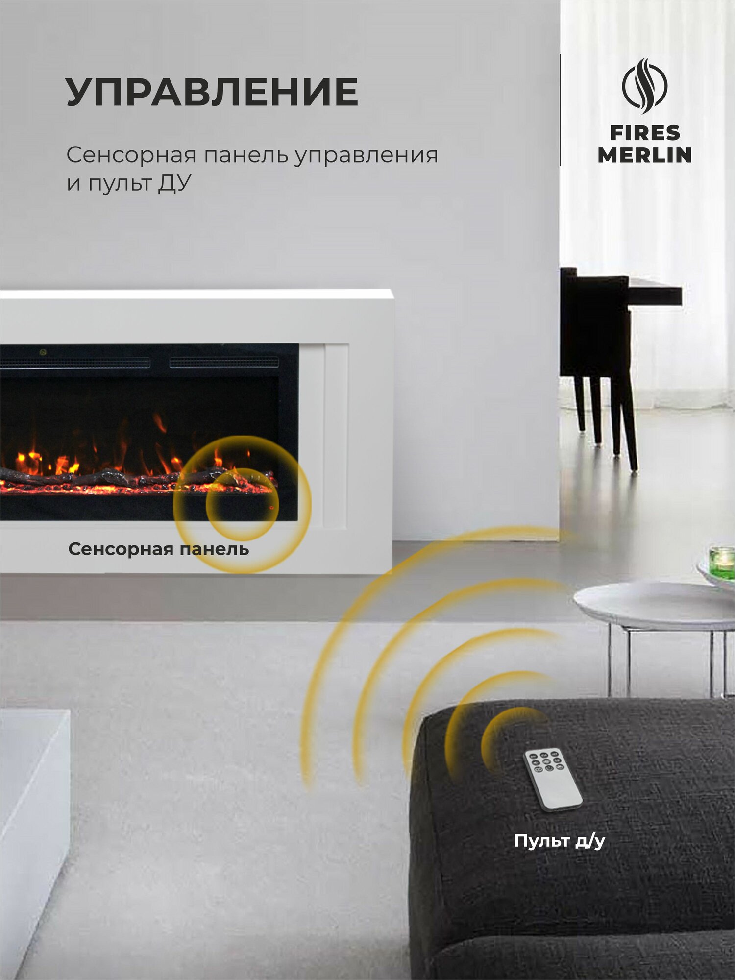 Электрокамин Fires Merlin Lord WT белый c очагом, звуковая имитация и пульт ДУ, современный стиль