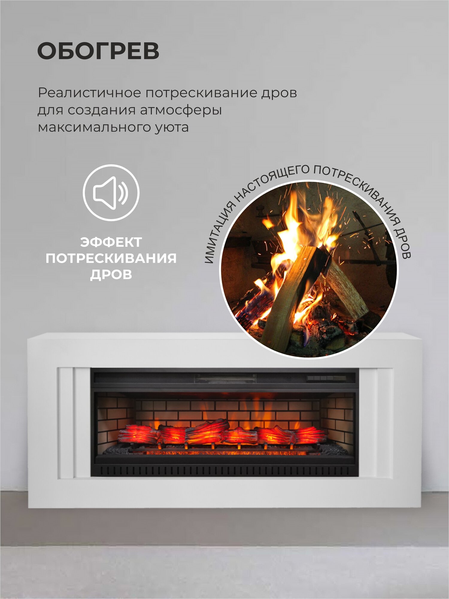 Электрокамин Fires Merlin Nord L белый напольный с очагом, звук потрескивания дров, обогрев, имитация пламени