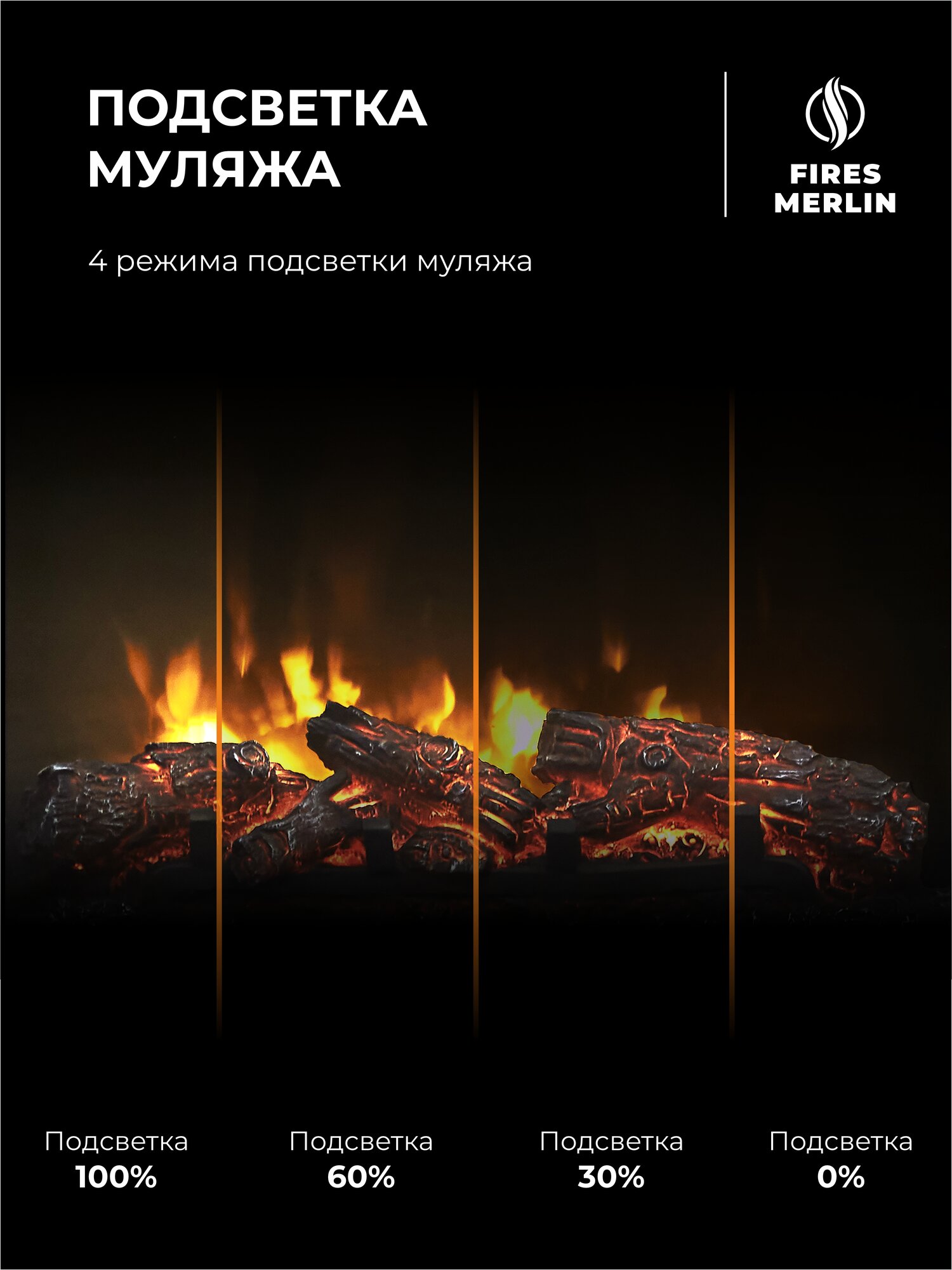 Камин электрический Fires Merlin Nord DN темный орех с очагом, пульт ДУ, с обогревом, эффект живого пламени