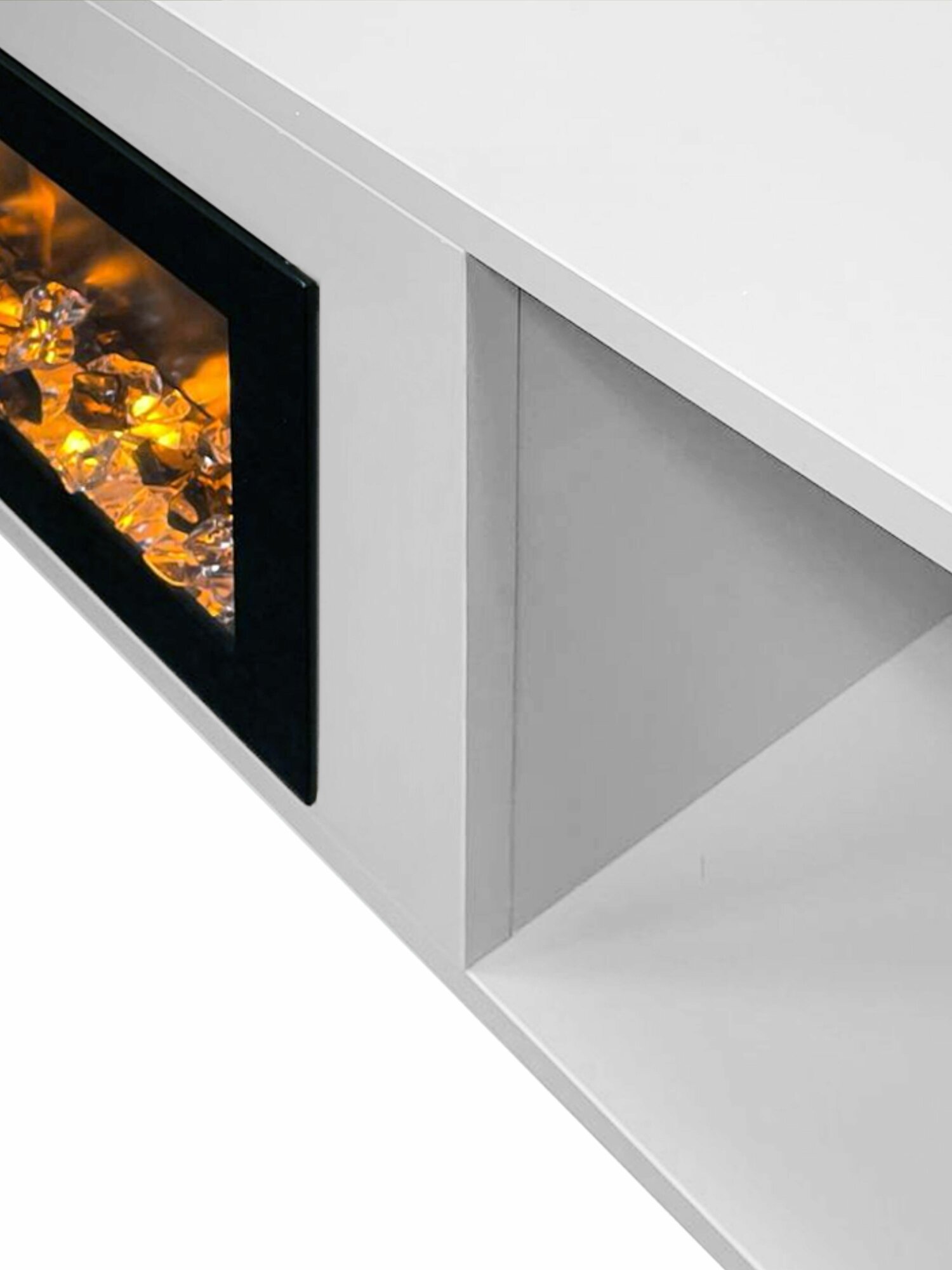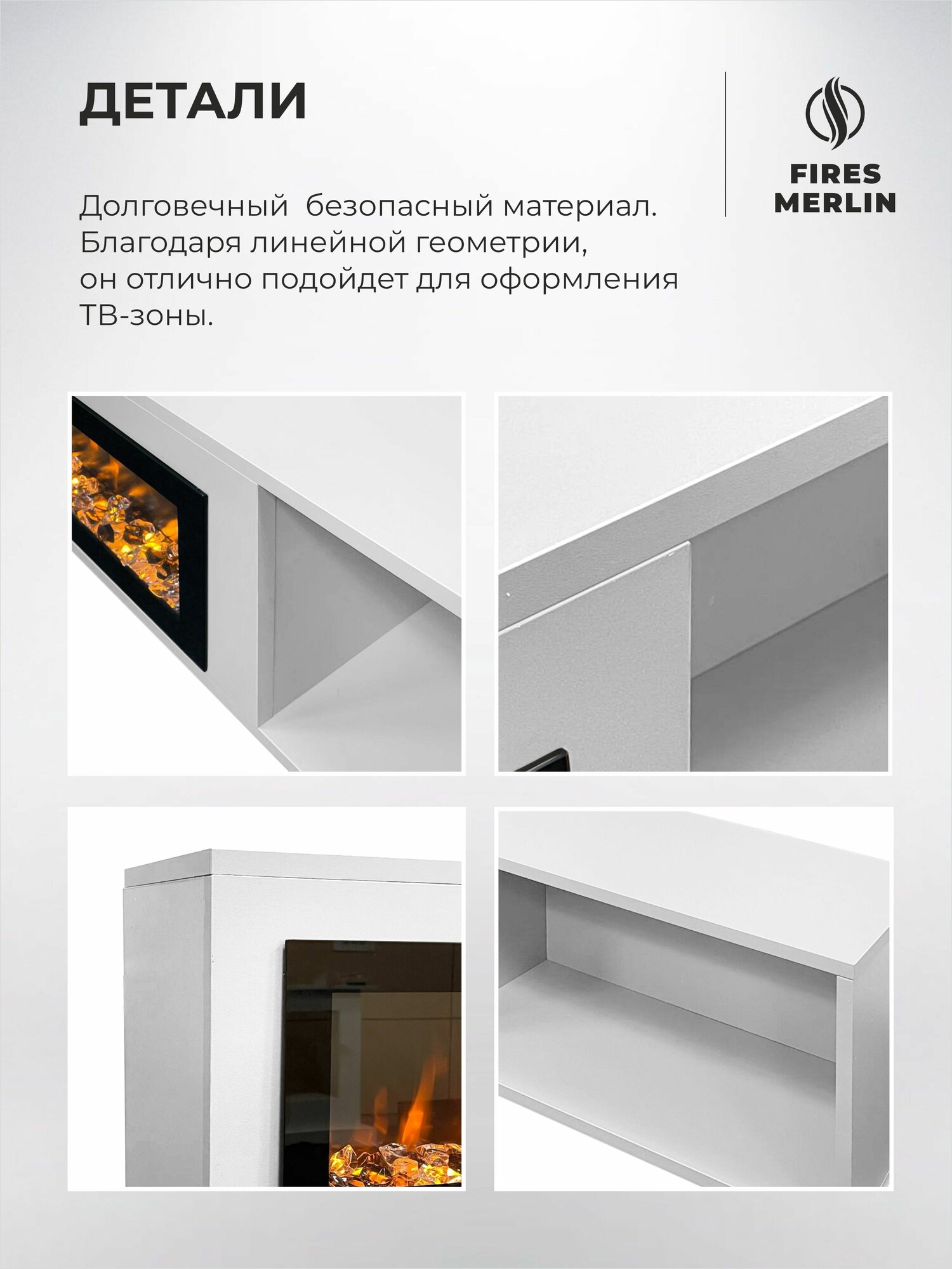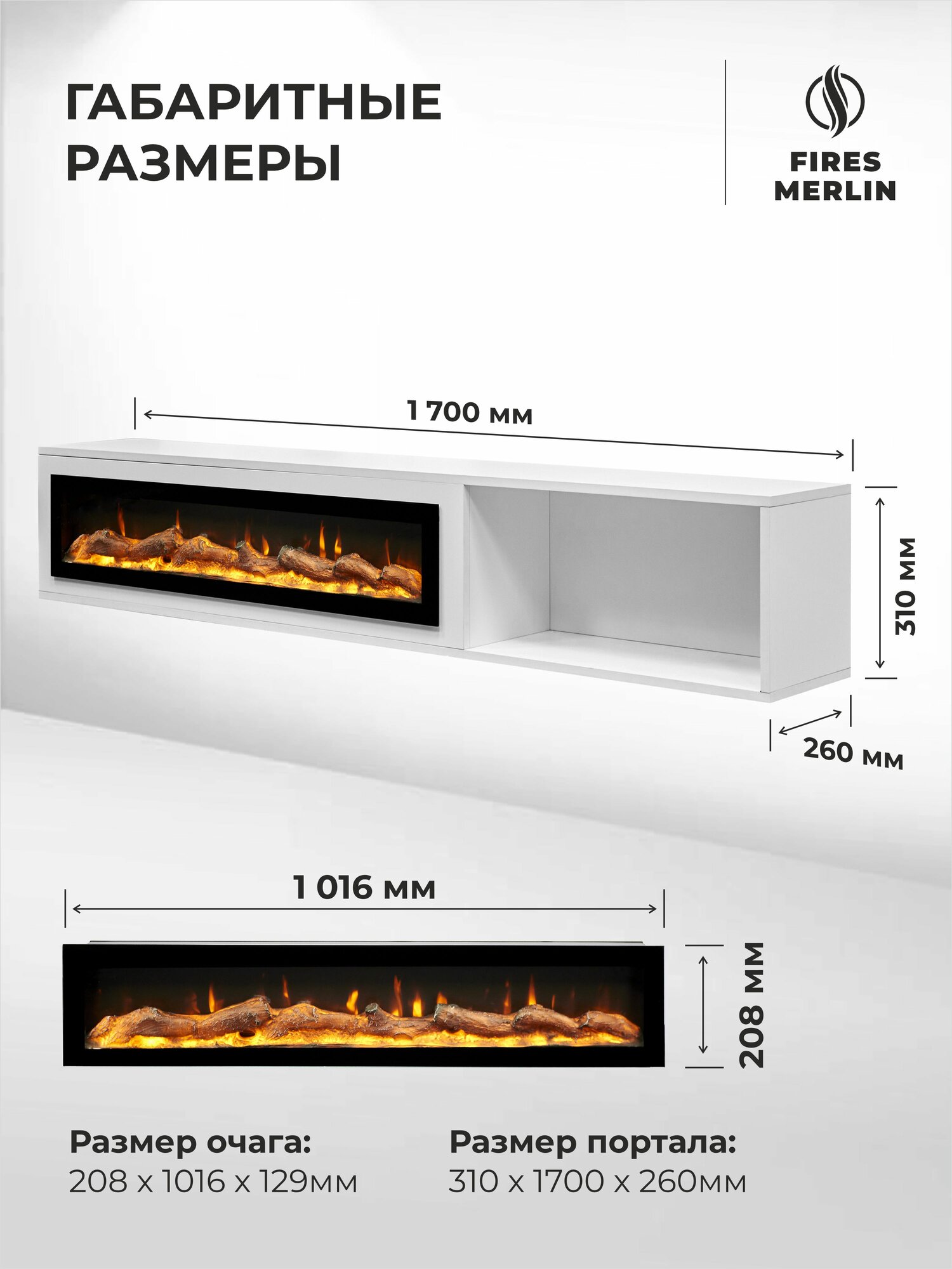 Электрокамин подвесной Fires Merlin Luxloft белый c очагом Rio, звук и пульт, эффект живого пламени, камин с полкой интересное: