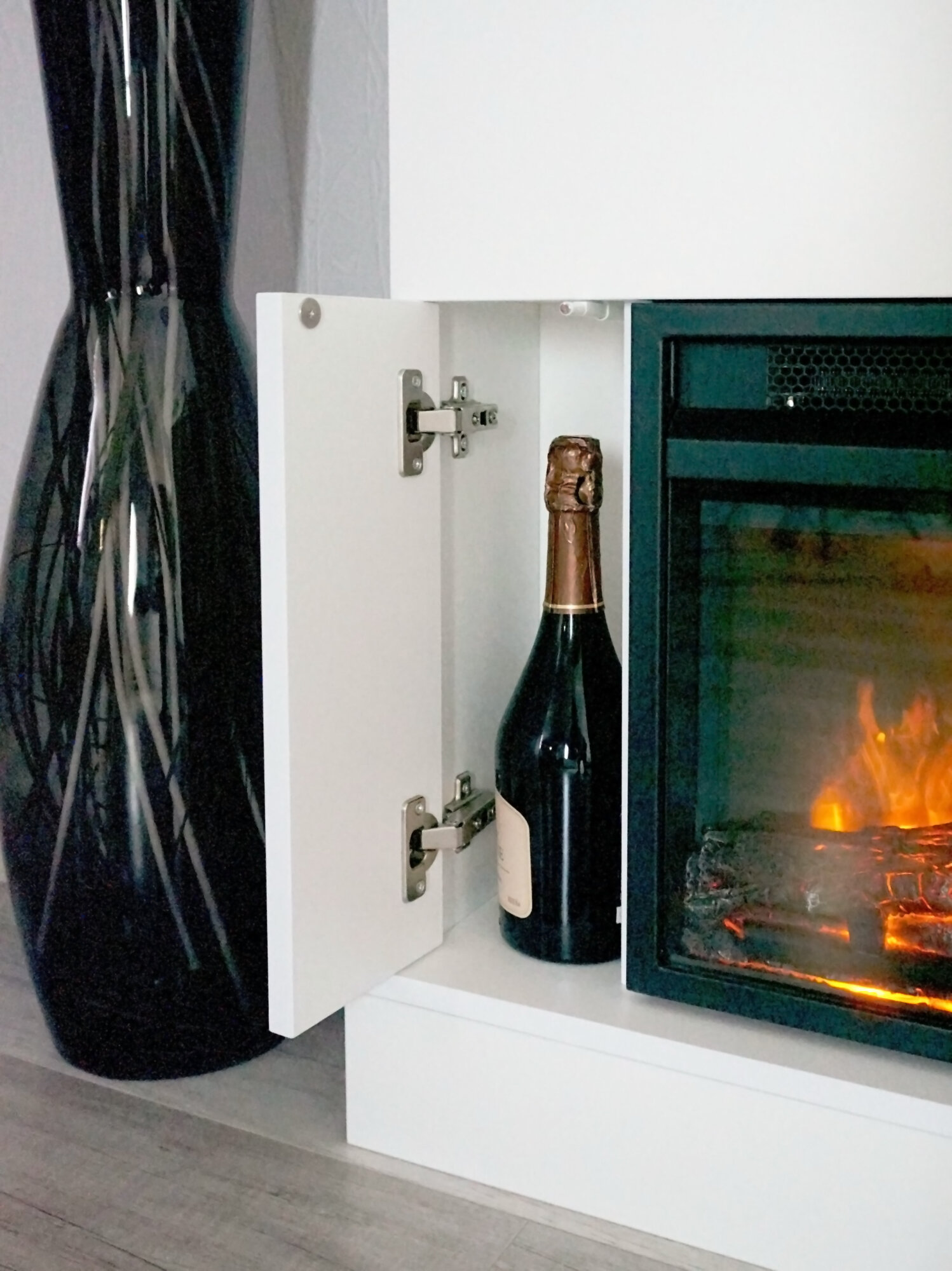 Купить Камин электрический VITAMIN с белым порталом, мини-баром и хранением для бутылок. Цвет "Белый" в комплекте с постером